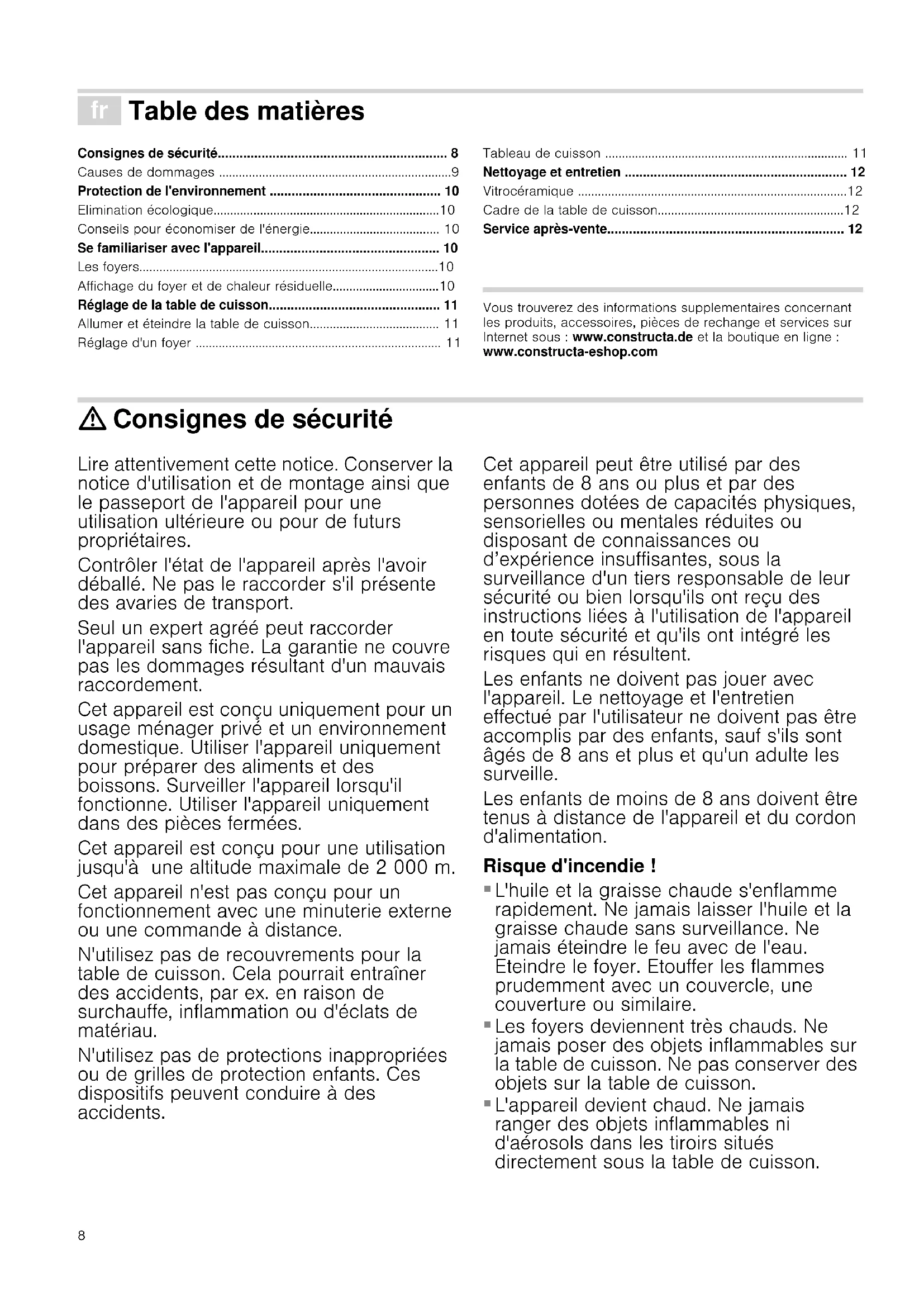 - Fortkochen ohne Deckel ** Ohne Deckel7 Kundendienst Wenn Ihr Gerät repariert werden muss, ist unser Kundendienst für Sie da. Wir finden immer eine passende Lösung, auch um unnötige Technikerbesuche zu vermeiden. E-Nummer und FD-Nummer: Wenn Sie unseren Kundendienst anfordern, geben Sie bitte die E-Nummer und FD-Nummer des Gerätes an. Das Typenschild mit den Nummern finden Sie auf dem Gerätepass. Beachten Sie, dass der Besuch des Kundendiensttechnikers im Falle einer Fehlbedienung auch während der Garantiezeit nicht kostenlos ist. Die Kontaktdaten aller Länder für den nächstgelegenen Kun- dendienst finden Sie hier bzw. im beiliegenden Kundendienst- Verzeichnis. Reparaturauftrag und Beratung bei Störungen Vertrauen Sie auf die Kompetenz des Herstellers. Sie stellen somit sicher, dass die Reparatur von geschulten Servicetechni- kern durchgeführt wird, die mit den Original-Ersatzteilen für Ihr Gerät ausgerüstet sind. A 0810 550 533 D 089 54 020 755 CH 0848 840 0408 Þ Table des matières [fr]Notice d’utilisation Consignes de sécurité............................................................... 8 Causes de dommages ......................................................................9 Protection de l'environnement ............................................... 10 Elimination écologique....................................................................10 Conseils pour économiser de l'énergie....................................... 10 Se familiariser avec l'appareil................................................. 10 Les foyers..........................................................................................10 Affichage du foyer et de chaleur résiduelle................................10 Réglage de la table de cuisson............................................... 11 Allumer et éteindre la table de cuisson....................................... 11 Réglage d'un foyer .......................................................................... 11 Tableau de cuisson ......................................................................... 11 Nettoyage et entretien ............................................................. 12 Vitrocéramique .................................................................................12 Cadre de la table de cuisson........................................................12 Service après-vente................................................................. 12 Produktinfo Vous trouverez des informations supplementaires concernant les produits, accessoires, pièces de rechange et services sur Internet sous : www.constructa.de et la boutique en ligne : www.constructa-eshop.com : Consignes de sécurité Lire attentivement cette notice. Conserver la notice d'utilisation et de montage ainsi que le passeport de l'appareil pour une utilisation ultérieure ou pour de futurs propriétaires. Contrôler l'état de l'appareil après l'avoir déballé. Ne pas le raccorder s'il présente des avaries de transport. Seul un expert agréé peut raccorder l'appareil sans fiche. La garantie ne couvre pas les dommages résultant d'un mauvais raccordement. Cet appareil est conçu uniquement pour un usage ménager privé et un environnement domestique. Utiliser l'appareil uniquement pour préparer des aliments et des boissons. Surveiller l'appareil lorsqu'il fonctionne. Utiliser l'appareil uniquement dans des pièces fermées. Cet appareil est conçu pour une utilisation jusqu'à une altitude maximale de 2 000 m. Cet appareil n'est pas conçu pour un fonctionnement avec une minuterie externe ou une commande à distance. N'utilisez pas de recouvrements pour la table de cuisson. Cela pourrait entraîner des accidents, par ex. en raison de surchauffe, inflammation ou d'éclats de matériau. N'utilisez pas de protections inappropriées ou de grilles de protection enfants. Ces dispositifs peuvent conduire à des accidents. Cet appareil peut être utilisé par des enfants de 8 ans ou plus et par des personnes dotées de capacités physiques, sensorielles ou mentales réduites ou disposant de connaissances ou d’expérience insuffisantes, sous la surveillance d'un tiers responsable de leur sécurité ou bien lorsqu'ils ont reçu des instructions liées à l'utilisation de l'appareil en toute sécurité et qu'ils ont intégré les risques qui en résultent. Les enfants ne doivent pas jouer avec l'appareil. Le nettoyage et l'entretien effectué par l'utilisateur ne doivent pas être accomplis par des enfants, sauf s'ils sont âgés de 8 ans et plus et qu'un adulte les surveille. Les enfants de moins de 8 ans doivent être tenus à distance de l'appareil et du cordon d'alimentation. Risque d'incendie !