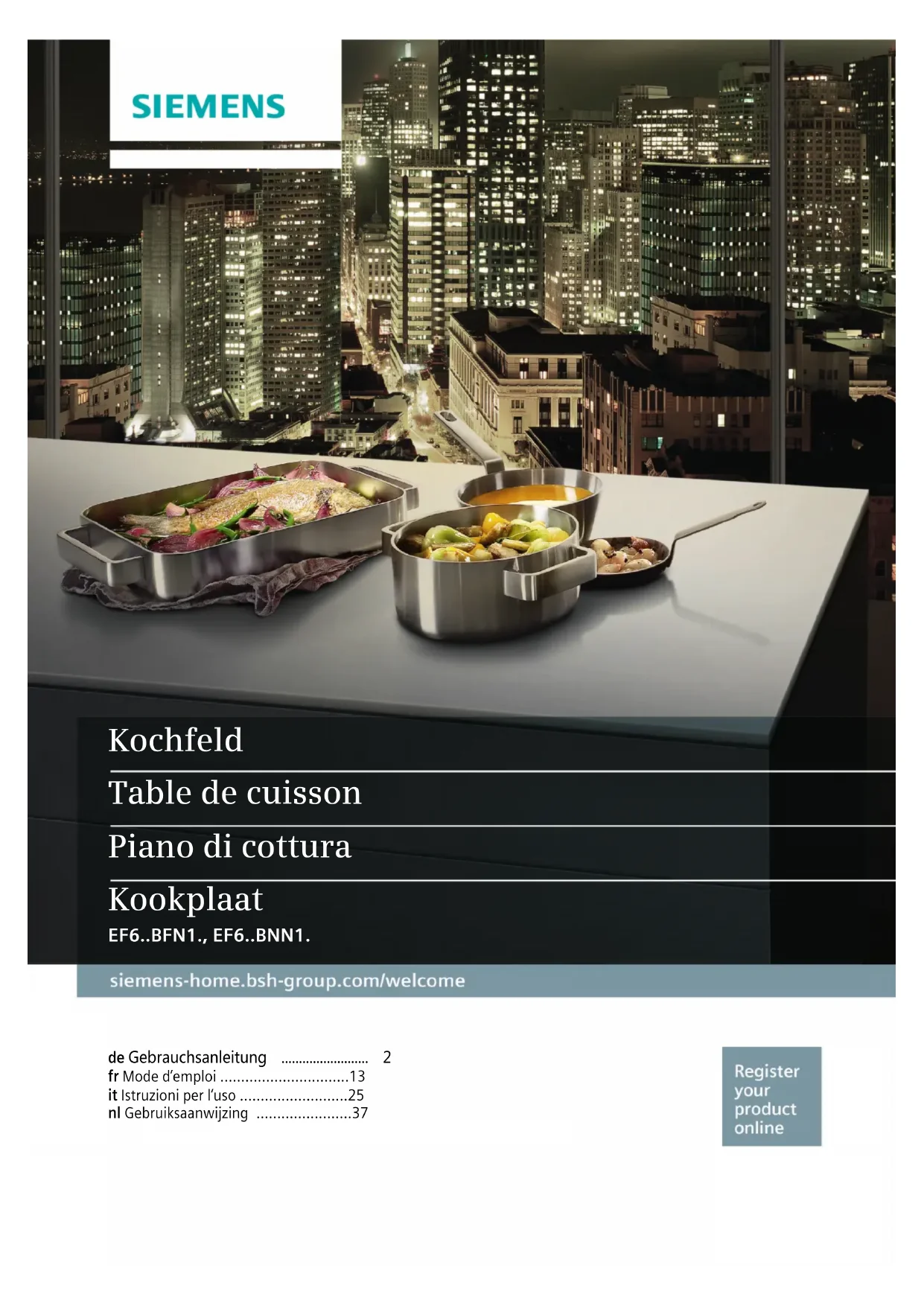 - Présentation de l'appareil . . . . . . . . . . . . . . . . . 16 Le bandeau de commande . . . . . . . . . . . . . . . . . . . . 16 Les foyers. . . . . . . . . . . . . . . . . . . . . . . . . . . . . . . . . .16 Indicateur de chaleur résiduelle . . . . . . . . . . . . . . . . . 16 1 Utilisation de l’appareil . . . . . . . . . . . . . . . . . . . 17 Allumer et éteindre la table de cuisson . . . . . . . . . . . 17 Réglage d'un foyer. . . . . . . . . . . . . . . . . . . . . . . . . . . 17 Tableau de cuisson . . . . . . . . . . . . . . . . . . . . . . . . . . 17 v Fonction PowerBoost . . . . . . . . . . . . . . . . . . . . 18 Activer la fonction Powerboost. . . . . . . . . . . . . . . . . . 18 Désactiver la fonction Powerboost. . . . . . . . . . . . . . . 18 A Sécurité-enfants. . . . . . . . . . . . . . . . . . . . . . . . . 18 Activer et désactiver la sécurité enfants. . . . . . . . . . . 18 Sécuritéenfants automatique . . . . . . . . . . . . . . . . . . . 18 b Coupure de sécurité automatique . . . . . . . . . . 19 Q Réglages de base. . . . . . . . . . . . . . . . . . . . . . . . 19 Modifier les réglages de base . . . . . . . . . . . . . . . . . . 19 D Nettoyage . . . . . . . . . . . . . . . . . . . . . . . . . . . . . . 20 Vitrocéramique. . . . . . . . . . . . . . . . . . . . . . . . . . . . . .20 Cadre de la table de cuisson. . . . . . . . . . . . . . . . . . . 20 3 Anomalies, que faire ?. . . . . . . . . . . . . . . . . . . . 21 Message E dans les affichages . . . . . . . . . . . . . . . . . 21 A clignote sur l'affichage des foyers . . . . . . . . . . . . . 21 4 Service après-vente . . . . . . . . . . . . . . . . . . . . . . 22 Numéro E et numéro FD . . . . . . . . . . . . . . . . . . . . . . 22 E Plats tests . . . . . . . . . . . . . . . . . . . . . . . . . . . . . . 22 Produktinfo Vous trouverez des informations supplementaires concernant les produits, accessoires, pièces de rechange et services sur Internet sous : www.siemens- home.bsh-group.com et la boutique en ligne : www.siemens-home.bsh-group.com/eshopsfr Utilisation conforme