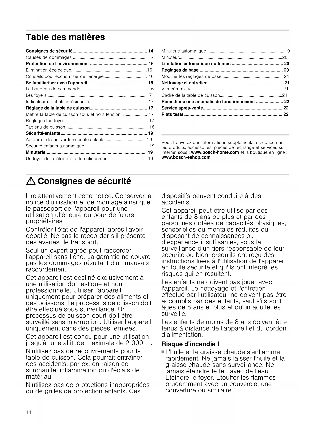 - Plats tests Produktinfo Vous trouverez des informations supplementaires concernant les produits, accessoires, pièces de rechange et services sur Internet sous : www.bosch-home.com et la boutique en ligne : www.bosch-eshop.com : Consignes de sécurité Lire attentivement cette notice. Conserver la notice d'utilisation et de montage ainsi que le passeport de l'appareil pour une utilisation ultérieure ou pour de futurs propriétaires. Contrôler l'état de l'appareil après l'avoir déballé. Ne pas le raccorder s'il présente des avaries de transport. Seul un expert agréé peut raccorder l'appareil sans fiche. La garantie ne couvre pas les dommages résultant d'un mauvais raccordement. Cet appareil est destiné exclusivement à une utilisation domestique et non professionnelle. Utiliser l'appareil uniquement pour préparer des aliments et des boissons. Le processus de cuisson doit être effectué sous surveillance. Un processus de cuisson court doit être surveillé sans interruption. Utiliser l'appareil uniquement dans des pièces fermées. Cet appareil est conçu pour une utilisation jusqu'à une altitude maximale de 2 000 m. N'utilisez pas de recouvrements pour la table de cuisson. Cela pourrait entraîner des accidents, par ex. en raison de surchauffe, inflammation ou d'éclats de matériau. N'utilisez pas de protections inappropriées ou de grilles de protection enfants. Ces dispositifs peuvent conduire à des accidents. Cet appareil peut être utilisé par des enfants de 8 ans ou plus et par des personnes dotées de capacités physiques, sensorielles ou mentales réduites ou disposant de connaissances ou d’expérience insuffisantes, sous la surveillance d'un tiers responsable de leur sécurité ou bien lorsqu'ils ont reçu des instructions liées à l'utilisation de l'appareil en toute sécurité et qu'ils ont intégré les risques qui en résultent. Les enfants ne doivent pas jouer avec l'appareil. Le nettoyage et l'entretien effectué par l'utilisateur ne doivent pas être accomplis par des enfants, sauf s'ils sont âgés de 8 ans et plus et qu'un adulte les surveille. Les enfants de moins de 8 ans doivent être tenus à distance de l'appareil et du cordon d'alimentation. Risque d'incendie ! p. 22