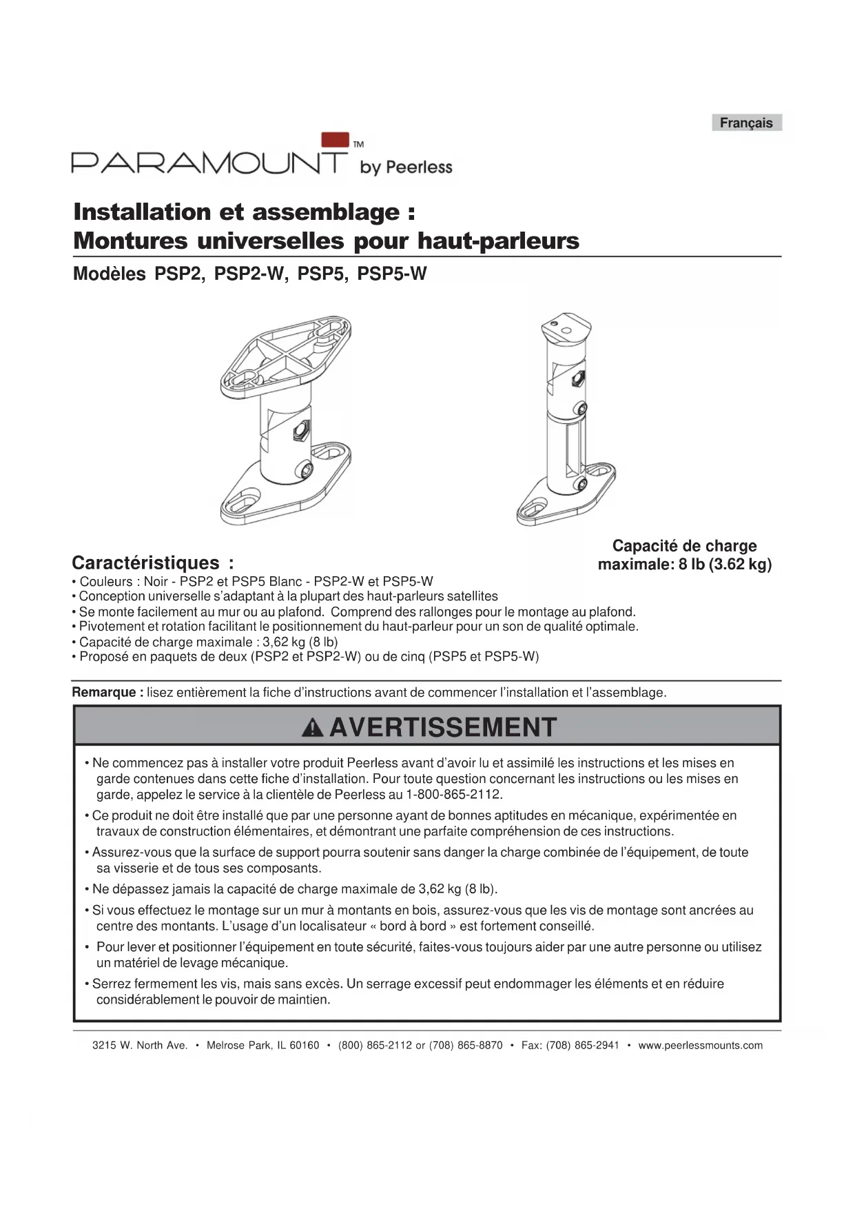 A o B A o B C3215 W. North Ave. • Melrose Park, IL 60160 • (800) 865-2112 or (708) 865-8870 • Fax: (708) 865-2941 • www.peerlessmounts.com Installation et assemblage : Montures universelles pour haut-parleurs Modèles PSP2, PSP2-W, PSP5, PSP5-W Français Caractéristiques :