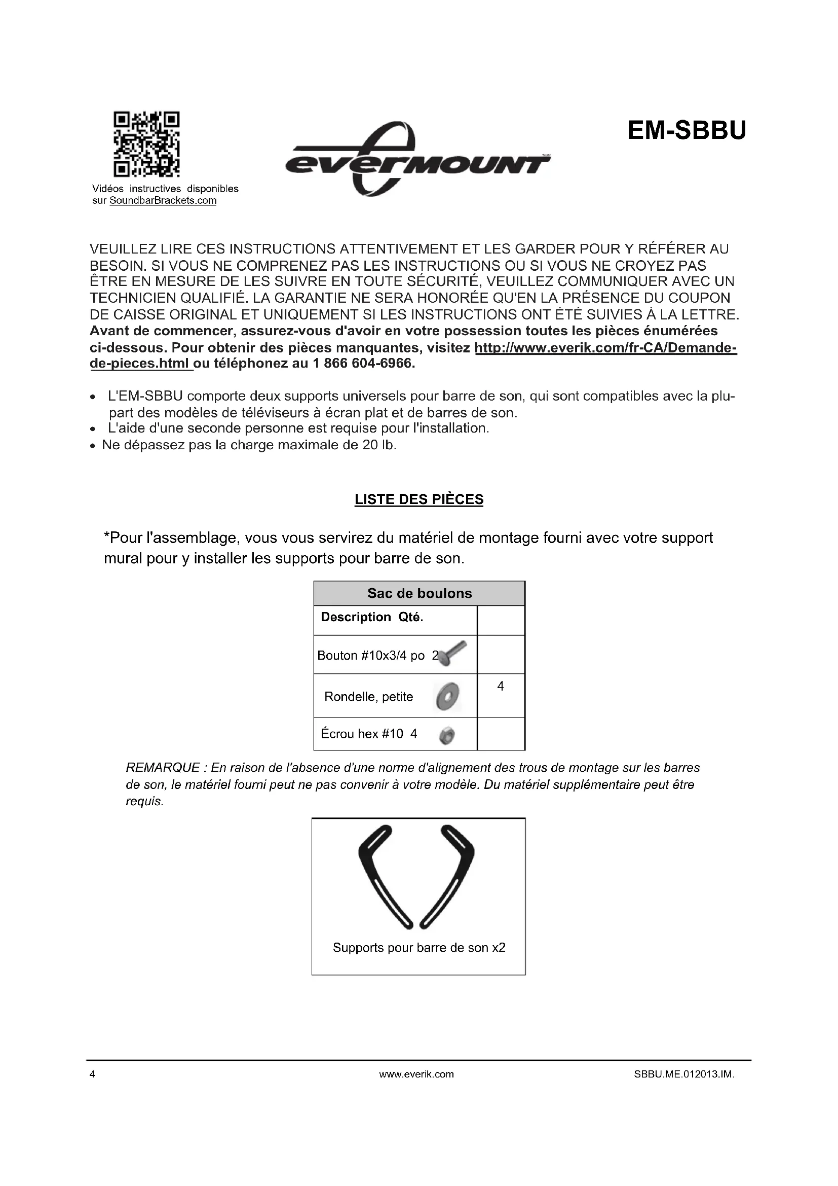 VEUILLEZ LIRE CES INSTRUCTIONS ATTENTIVEMENT ET LES GARDER POUR Y RÉFÉRER AU BESOIN. SI VOUS NE COMPRENEZ PAS LES INSTRUCTIONS OU SI VOUS NE Croyez PAS ÉTRE EN MESURE DE LES SUIVRE EN Toute SECURITE, VEUILLEZ COMMUNIQUEUR AVEC UN TECHNICIEN QUALIFIÉ. LA GARANTIE NE SERA HONORÉE QU'en LA PRESENCE DU COUPON DE CAISSE ORIGINAL ET UNIQUÉMENT SI LES INSTRUCTIONS ONT ÉTÉ SUIVIES À LA LETTRE. Avant de commencer, assurez-vous d'avoir en votre possession toutes les pieces enumeratedes ci-dessous. Pour obtenir des pièces manquantes, visitez http://www.everik.com/fr-CA/Demande-pieces.html ou téléphone au 1 866 604-6966.