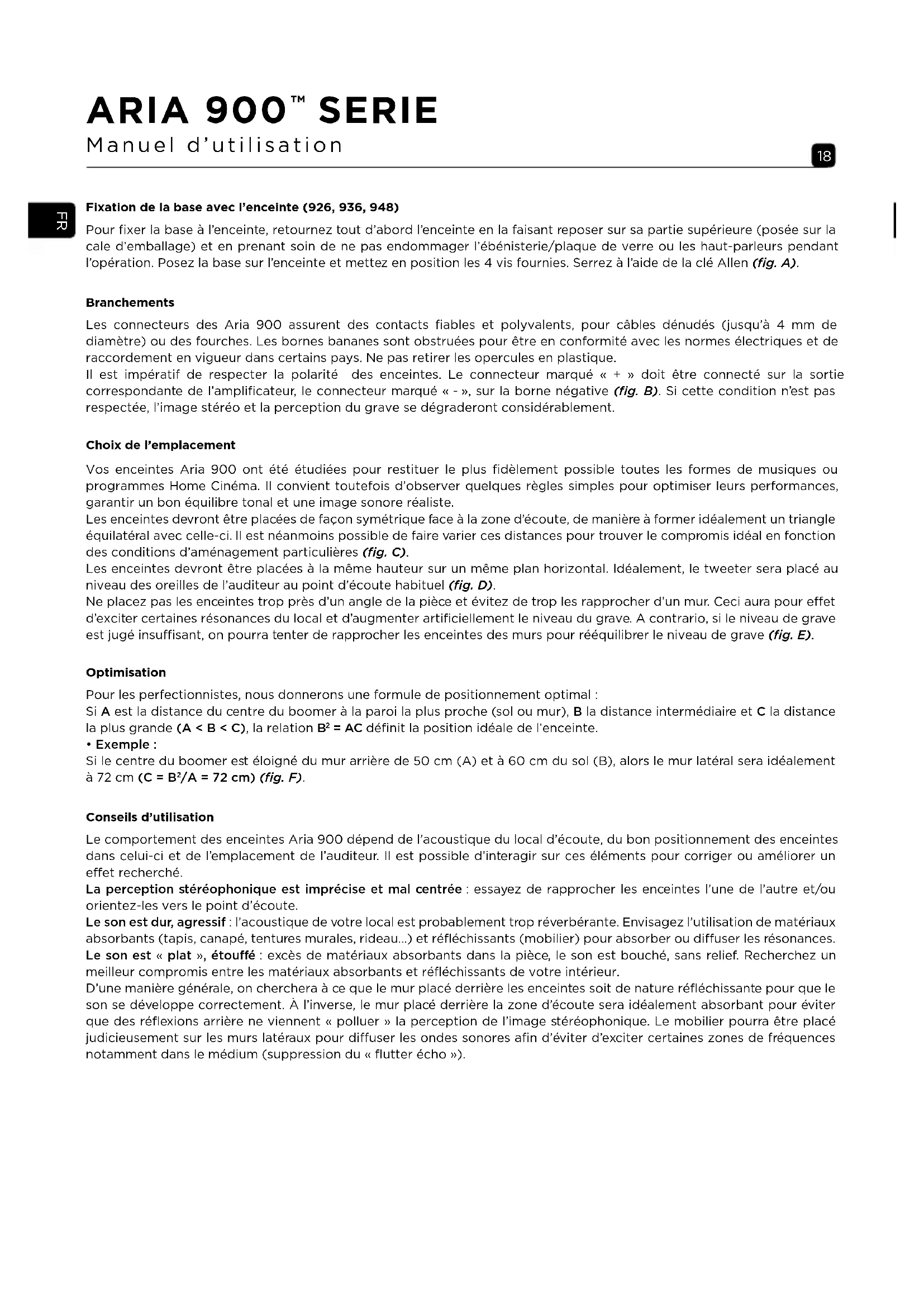Vos enceintes Aria 900 ont ete estudiees pour restituer le plus fidement possible toutes les formes de musiques ou programmes Home Cinema. Il convient toutefois d'observer quelques regles simples pour optimiser leurs performances, garantir un bon equilibre tonal et une image sonore realiste.