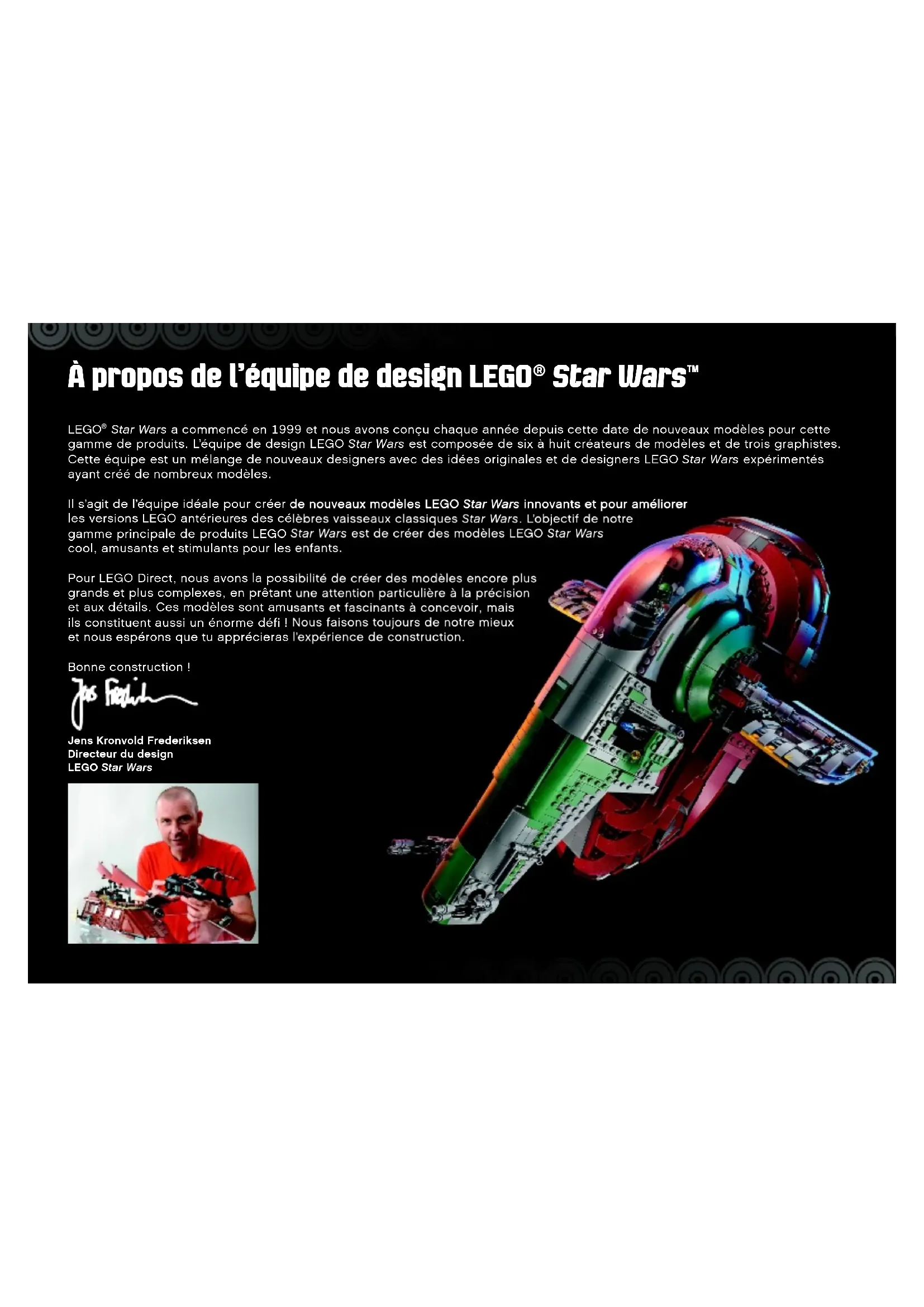 R: Je suis surtout fier d'avoir été choisi pour concevoir l'ensemble. Je suis un grand fan de Star Wars, et le Slave I est un vaisseau célèbre, l'un des rares qui n'avait pas encore été transformé en édition pour collectionneurs LEGO. Avoir pu créer moi-même le prochain ajout à mon importante collection d'ensembles LEGO Star Wars est un sentiment fantastique !
