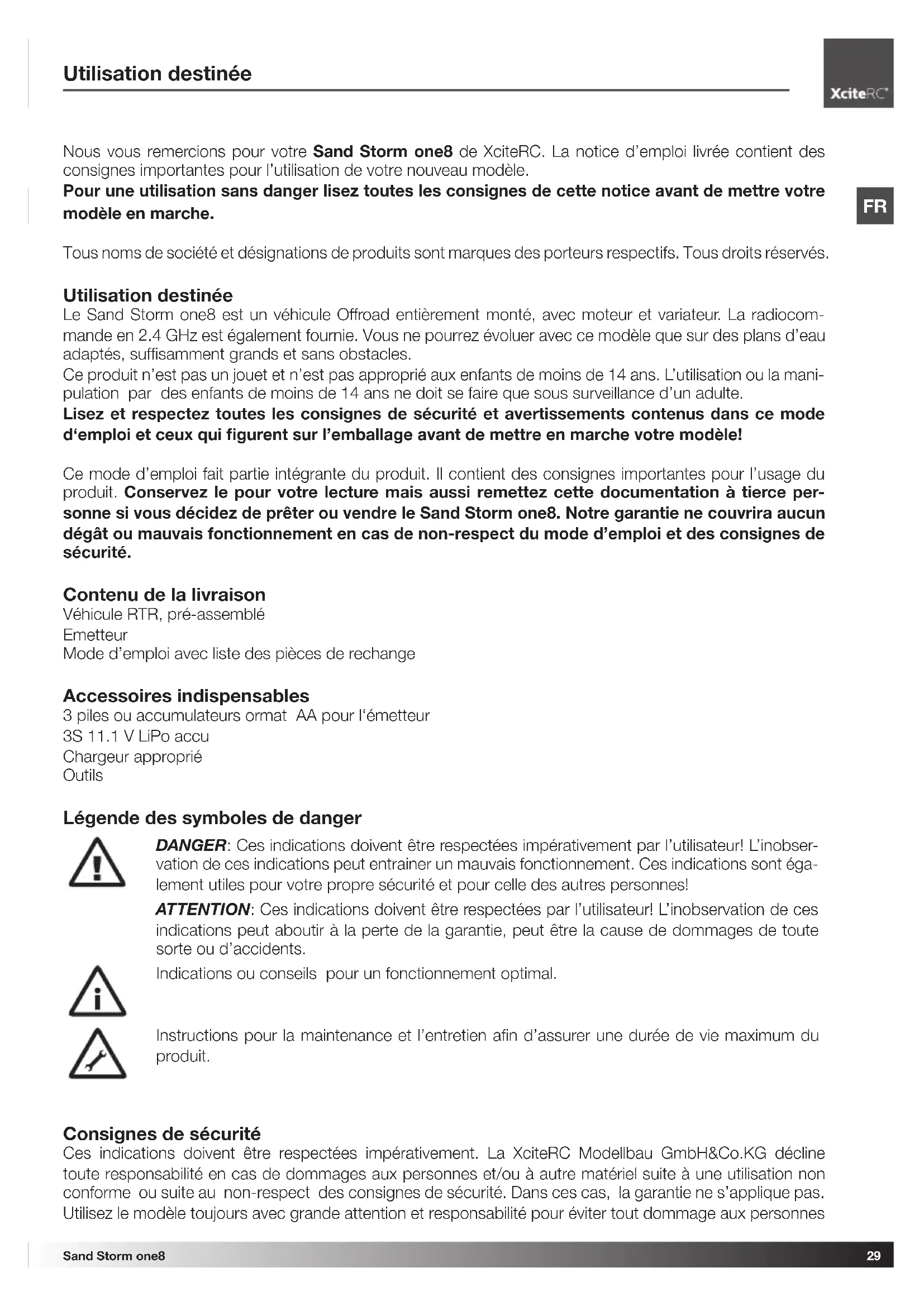 vation de ces indications peut entrainer un mauvais fonctionnement. Ces indications sont éga- lement utiles pour votre propre sécurité et pour celle des autres personnes! ATTENTION: Ces indications doivent être respectées par l’utilisateur! L’inobservation de ces indications peut aboutir à la perte de la garantie, peut être la cause de dommages de toute sorte ou d’accidents. Indications ou conseils pour un fonctionnement optimal. Instructions pour la maintenance et l’entretien afin d’assurer une durée de vie maximum du produit. Consignes de sécurité Ces indications doivent être respectées impérativement. La XciteRC Modellbau GmbH&Co.KG décline toute responsabilité en cas de dommages aux personnes et/ou à autre matériel suite à une utilisation non conforme ou suite au non-respect des consignes de sécurité. Dans ces cas, la garantie ne s’applique pas. Utilisez le modèle toujours avec grande attention et responsabilité pour éviter tout dommage aux personnes30 Sand Storm one8