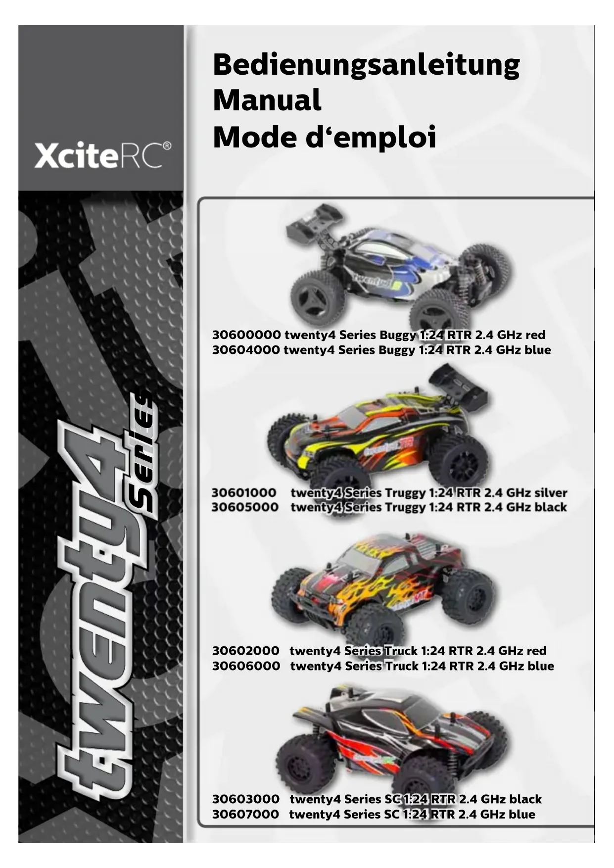 vation de ces indications peut entrainer un mauvais fonctionnement. Ces indications sont éga- lement utiles pour votre propre sécurité et pour celle des autres personnes! ATTENTION: Ces indications doivent être respectées par l’utilisateur! L’inobservation de ces indications peut aboutir à la perte de la garantie, peut être la cause de dommages de toute sorte ou d’accidents. Indications ou conseils pour un fonctionnement optimal. Instructions pour la maintenance et l’entretien afin d’assurer une durée de vie maximum du produit. Consignes de sécurité Ces indications doivent être respectées impérativement. La XciteRC Modellbau GmbH&Co.KG décline toute responsabilité en cas de dommages aux personnes et/ou à autre matériel suite à une utilisation non conforme ou suite au non-respect des consignes de sécurité. Dans ces cas, la garantie ne s’applique pas. Utilisez le modèle toujours avec grande attention et responsabilité pour éviter tout dommage aux personnes ou/et autre matériel. Nous recommandons également de souscrire une assurance de responsabilité civile. Si vous avez déjà une assurance de responsabilité civile, informez- vous soigneusement si votre contrat vous30 twenty4 series