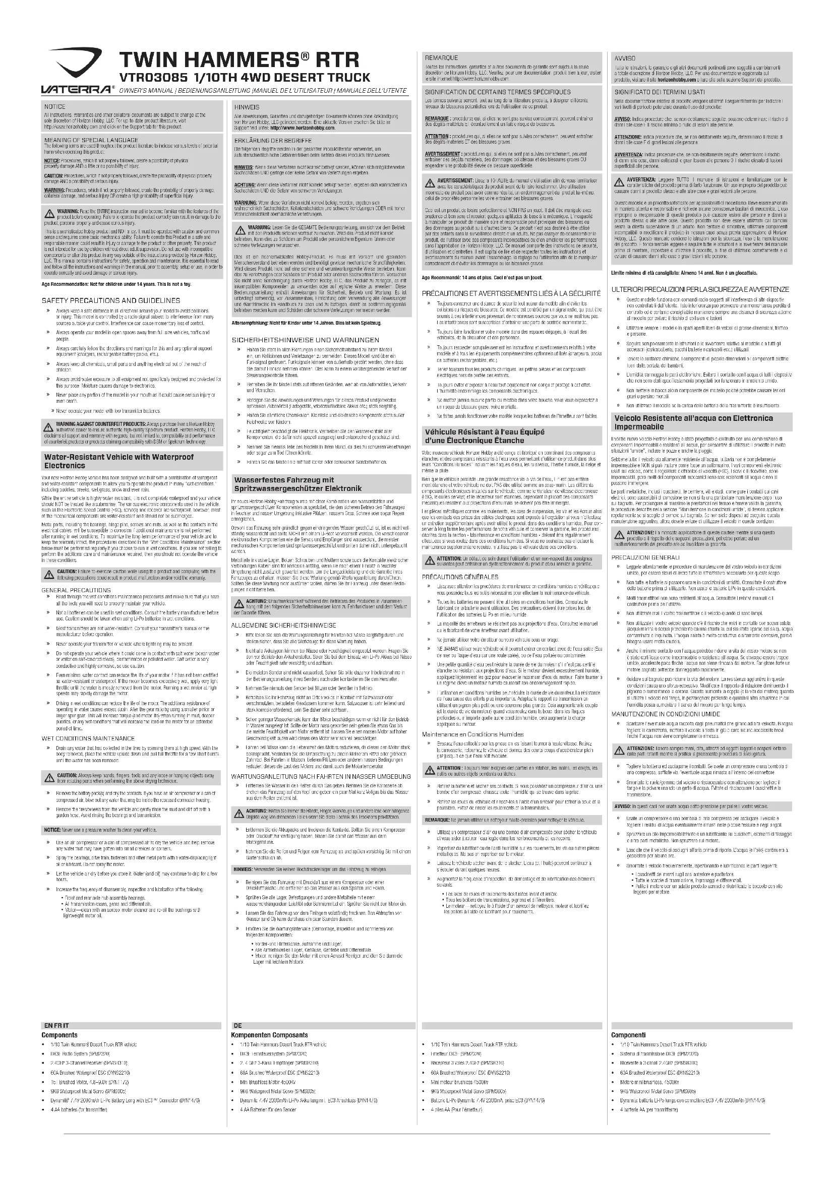 - Motor: reinigen Sie den Motor mit einen Aerosol Reiniger und ölen Sie dann die Lager mit leichtem Motoröl.Votre nouveau véhicule Horizon Hobby a été conçu et fabriqué en combinant des composants étanches et des composants résistants à l’eau vous permettant d’utiliser ce produit dans plus-ieurs “Conditions Humides” incluant les flaques d’eau, les ruisseaux, l’herbe humide, la neige et même la pluie.Bien que le véhicule possède une grande résistance vis-à-vis de l’eau, il n’est pas entière-ment étanche et votre véhicule ne doit PAS être utilisé comme un sous-marin. Les différents composants électroniques installés sur le véhicule, comme le Variateur de vitesse électronique (ESC), le ou les servo(s) et le récepteur sont étanches, cependant la plupart des composants mécaniques résistent aux projections d’eau mais ne doivent pas être immergés.Les pièces métalliques comme les roulements, les axes de suspension, les vis et les écrous ainsi que les contacts des prises des câbles électriques sont exposés à l’oxydation si vous n’effectuez un entretien supplémentaire après avoir utilisé le produit dans des conditions humides. Pour con-server à long terme les performances de votre véhicule et conserver la garantie, les procédures décrites dans la section « Maintenance en conditions humides » doivent être régulièrement effectuées si vous roulez dans des conditions humides. Si vous ne souhaitez pas effectuer la maintenance supplémentaire requise, n’utilisez pas le véhicule dans ces conditions.ATTENTION: Un défaut de soin durant l’utilisation et un non-respect des consignes suivantes peut entraîner un dysfonctionnement du produit et/ou annuler la garantie.PRÉCAUTIONS GÉNÉRALES » Lisez avec attention les procédures de maintenance en conditions humides et vérifiez que vous possédez tous les outils nécessaires pour effectuer la maintenance du véhicule. » Toutes les batteries ne peuvent être utilisées en conditions humides. Consultez le fabricant de la batterie avant utilisation. Des précautions doivent être prises lors de l’utilisation des batteries Li-Po en milieu humide. » La majorité des émetteurs ne résistent pas aux projections d’eau. Consultez le manuel ou le fabricant de votre émetteur avant utilisation. » Ne jamais utiliser votre émetteur ou votre véhicule sous un orage. » NE JAMAIS utiliser votre véhicule où il pourrait entrer en contact avec de l’eau salée (Eau de mer ou flaque d’eau sur une route salée), ou de l’eau polluée ou contaminée. » Une petite quantité d’eau peut réduire la durée de vie du moteur s’il n’est pas certifié étanche ou résistant aux projections d’eau. Si le moteur devient excessivement humide, appliquez légèrement les gaz pour évacuer le maximum d’eau du moteur. Faire tourner à un régime élevé un moteur humide causerait son endommagement rapide. » L’utilisation en conditions humides peut réduire la durée de vie du moteur. La résistance de l’eau cause des efforts plus importants. Adaptez le rapport de transmission en utilisant un pignon plus petit ou une couronne plus grande. Cela augmentera le couple (et la durée de vie du moteur) quand vous roulez dans la boue, dans les flaques profondes ou n’importe quelle autre condition humide, cela augmente la charge appliquée au moteur.Maintenance en Conditions Humides » Evacuez l’eau collectée par les pneus en les faisant tourner à haute vitesse.Retirez la carrosserie, retournez le véhicule et donnez des courts coups d’accélérateur plein gaz jusqu’à ce que l’eau soit évacuée.ATTENTION : Toujours tenir éloignés des parties en rotation, les mains, les doigts, les outils ou autres objets pendants ou lâches. » Retirez la batterie et séchez ses contacts. Si vous possédez un compresseur d’air ou une bombe d’air compressé, chassez toute l’humidité qui se trouve dans la prise. » Retirez les roues du véhicule et rincez-les à l’aide d’un arrosoir pour retirer la boue et la poussière. Evitez de rincer les roulements et la transmission.REMARQUE: Ne jamais utiliser un nettoyeur haute-pression pour nettoyer le véhicule. » Utilisez un compresseur d’air ou une bombe d’air compressée pour sécher le véhicule et vous aider à retirer l’eau logée dans les renfoncements et les recoins. » Vaporisez du lubrifiant ou de l’anti-humidité sur les roulements, les vis ou autres pièces métalliques. Ne pas en vaporiser sur le moteur. » Laissez le véhicule sécher avant de le stocker. L’eau (et l’huile) peuvent continuer à s’écouler durant quelques heures. » Augmentez la fréquence d’inspection, de démontage et de lubrification des éléments suivants: