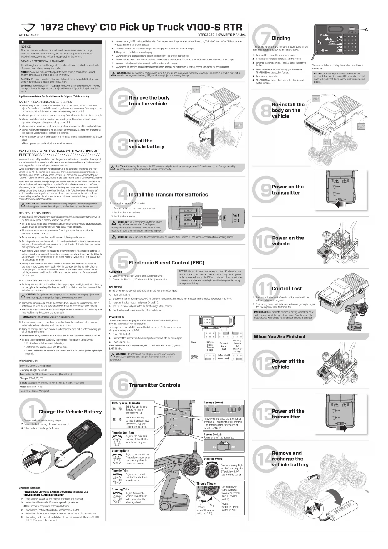 Retrouvez gratuitement la notice de l'appareil 1972 Chevy C10 Pickup Truck V100 S 1:10 Vaterra au format PDF.