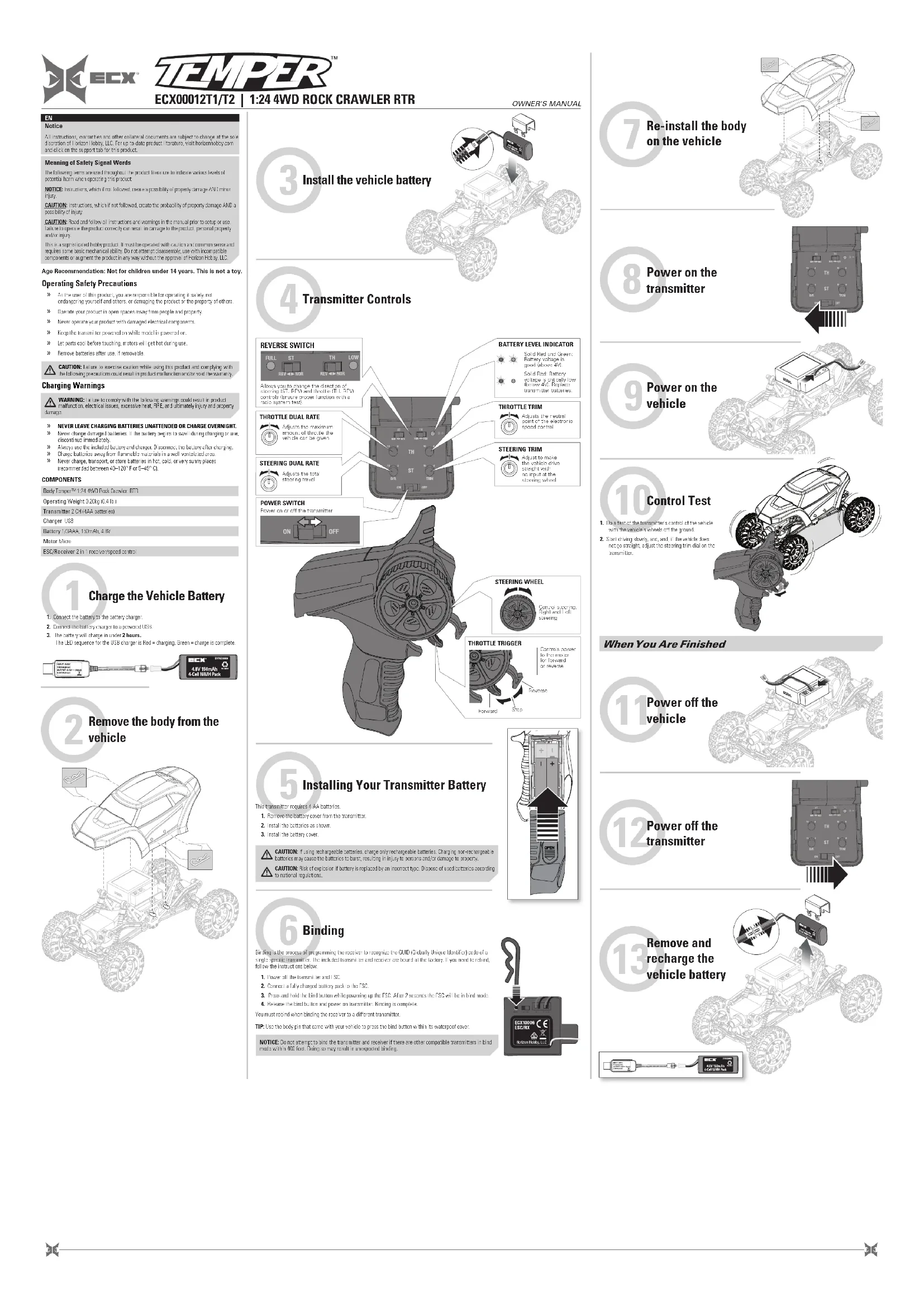 Vous devez effectuer une réaffectation quand vous utilisez le récepteur avec un émetteur différent. CONSEIL: Utilisez le clip de carrosserie de votre véhicule pour appuyer sur le bouton affectation dans la protection étanche. REMARQUE: Ne tentez pas d’effectuer l’affectation quand un autre émetteur compatible est également en mode affectation à une distance inférieure à 120m. Vous risqueriez d’affecter votre récepteur à l’autre émetteur. Mettez le véhicule sous tension Mettez le véhicule hors tension Retirez et rechargez la batterie du véhicule Rouge et verte allu- mées fixes: La tension des piles est correcte (Supérieure à 4V) Rouge fixe seule : La tension des piles est faible (en dessous de 4V). Remplacez les piles de l’émetteurCOMPONENTICarrozzeria Temper 1:24 4WD Rock Crawler: RTRPeso operativo 0,2kgTrasmettitore 2 CH (4 batterie AA)Caricabatterie USBBatteria 1/3AAA, 150mAh, 4,8VMotore MicroRicevente/ESC 2 in 1 ricevente/ESC ECX00012T1/T2 | 1:24 4WD ROCK CRAWLER RTR