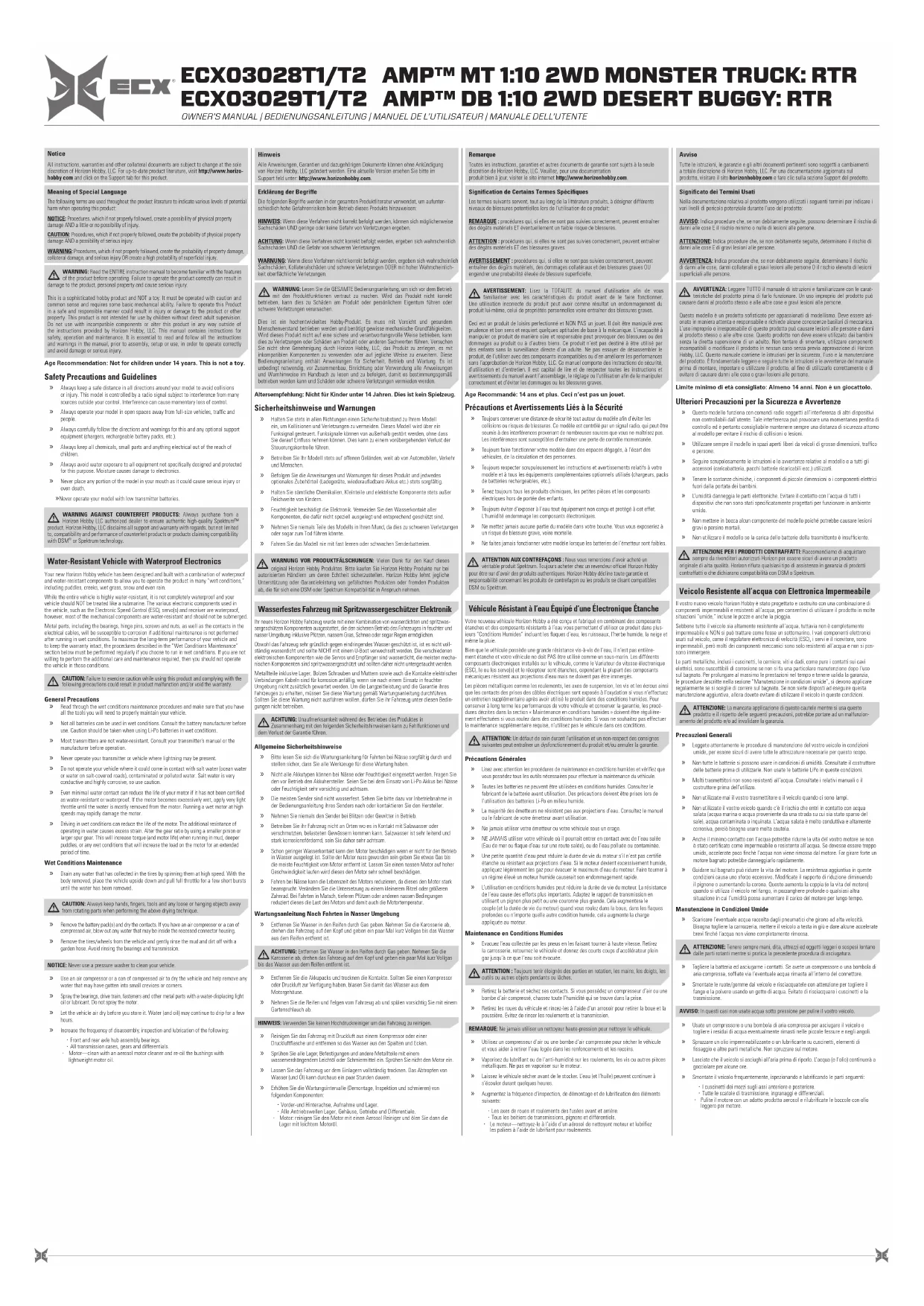 - Motor: reinigen Sie den Motor mit einen Aerosol Reiniger und ölen Sie dann die Lager mit leichtem Motoröl.Votre nouveau véhicule Horizon Hobby a été conçu et fabriqué en combinant des composants étanches et des composants résistants à l’eau vous permettant d’utiliser ce produit dans plus-ieurs “Conditions Humides” incluant les flaques d’eau, les ruisseaux, l’herbe humide, la neige et même la pluie.Bien que le véhicule possède une grande résistance vis-à-vis de l’eau, il n’est pas entière-ment étanche et votre véhicule ne doit PAS être utilisé comme un sous-marin. Les différents composants électroniques installés sur le véhicule, comme le Variateur de vitesse électronique (ESC), le ou les servo(s) et le récepteur sont étanches, cependant la plupart des composants mécaniques résistent aux projections d’eau mais ne doivent pas être immergés.Les pièces métalliques comme les roulements, les axes de suspension, les vis et les écrous ainsi que les contacts des prises des câbles électriques sont exposés à l’oxydation si vous n’effectuez un entretien supplémentaire après avoir utilisé le produit dans des conditions humides. Pour conserver à long terme les performances de votre véhicule et conserver la garantie, les procé-dures décrites dans la section « Maintenance en conditions humides » doivent être régulière-ment effectuées si vous roulez dans des conditions humides. Si vous ne souhaitez pas effectuer la maintenance supplémentaire requise, n’utilisez pas le véhicule dans ces conditions.ATTENTION: Un défaut de soin durant l’utilisation et un non-respect des consignes suivantes peut entraîner un dysfonctionnement du produit et/ou annuler la garantie. Précautions Générales » Lisez avec attention les procédures de maintenance en conditions humides et vérifiez que vous possédez tous les outils nécessaires pour effectuer la maintenance du véhicule. » Toutes les batteries ne peuvent être utilisées en conditions humides. Consultez le fabricant de la batterie avant utilisation. Des précautions doivent être prises lors de l’utilisation des batteries Li-Po en milieu humide. » La majorité des émetteurs ne résistent pas aux projections d’eau. Consultez le manuel ou le fabricant de votre émetteur avant utilisation. » Ne jamais utiliser votre émetteur ou votre véhicule sous un orage. » NE JAMAIS utiliser votre véhicule où il pourrait entrer en contact avec de l’eau salée (Eau de mer ou flaque d’eau sur une route salée), ou de l’eau polluée ou contaminée. » Une petite quantité d’eau peut réduire la durée de vie du moteur s’il n’est pas certifié étanche ou résistant aux projections d’eau. Si le moteur devient excessivement humide, appliquez légèrement les gaz pour évacuer le maximum d’eau du moteur. Faire tourner à un régime élevé un moteur humide causerait son endommagement rapide. » L’utilisation en conditions humides peut réduire la durée de vie du moteur. La résistance de l’eau cause des efforts plus importants. Adaptez le rapport de transmission en utilisant un pignon plus petit ou une couronne plus grande. Cela augmentera le couple (et la durée de vie du moteur) quand vous roulez dans la boue, dans les flaques profondes ou n’importe quelle autre condition humide, cela augmente la charge appliquée au moteur. Maintenance en Conditions Humides » Evacuez l’eau collectée par les pneus en les faisant tourner à haute vitesse.Retirez la carrosserie, retournez le véhicule et donnez des courts coups d’accélérateur plein gaz jusqu’à ce que l’eau soit évacuée.ATTENTION : Toujours tenir éloignés des parties en rotation, les mains, les doigts, les outils ou autres objets pendants ou lâches. » Retirez la batterie et séchez ses contacts. Si vous possédez un compresseur d’air ou une bombe d’air compressé, chassez toute l’humidité qui se trouve dans la prise. » Retirez les roues du véhicule et rincez-les à l’aide d’un arrosoir pour retirer la boue et la poussière. Evitez de rincer les roulements et la transmission.REMARQUE: Ne jamais utiliser un nettoyeur haute-pression pour nettoyer le véhicule. » Utilisez un compresseur d’air ou une bombe d’air compressée pour sécher le véhicule et vous aider à retirer l’eau logée dans les renfoncements et les recoins. » Vaporisez du lubrifiant ou de l’anti-humidité sur les roulements, les vis ou autres pièces métalliques. Ne pas en vaporiser sur le moteur. » Laissez le véhicule sécher avant de le stocker. L’eau (et l’huile) peuvent continuer à s’écouler durant quelques heures. » Augmentez la fréquence d’inspection, de démontage et de lubrification des éléments suivants: