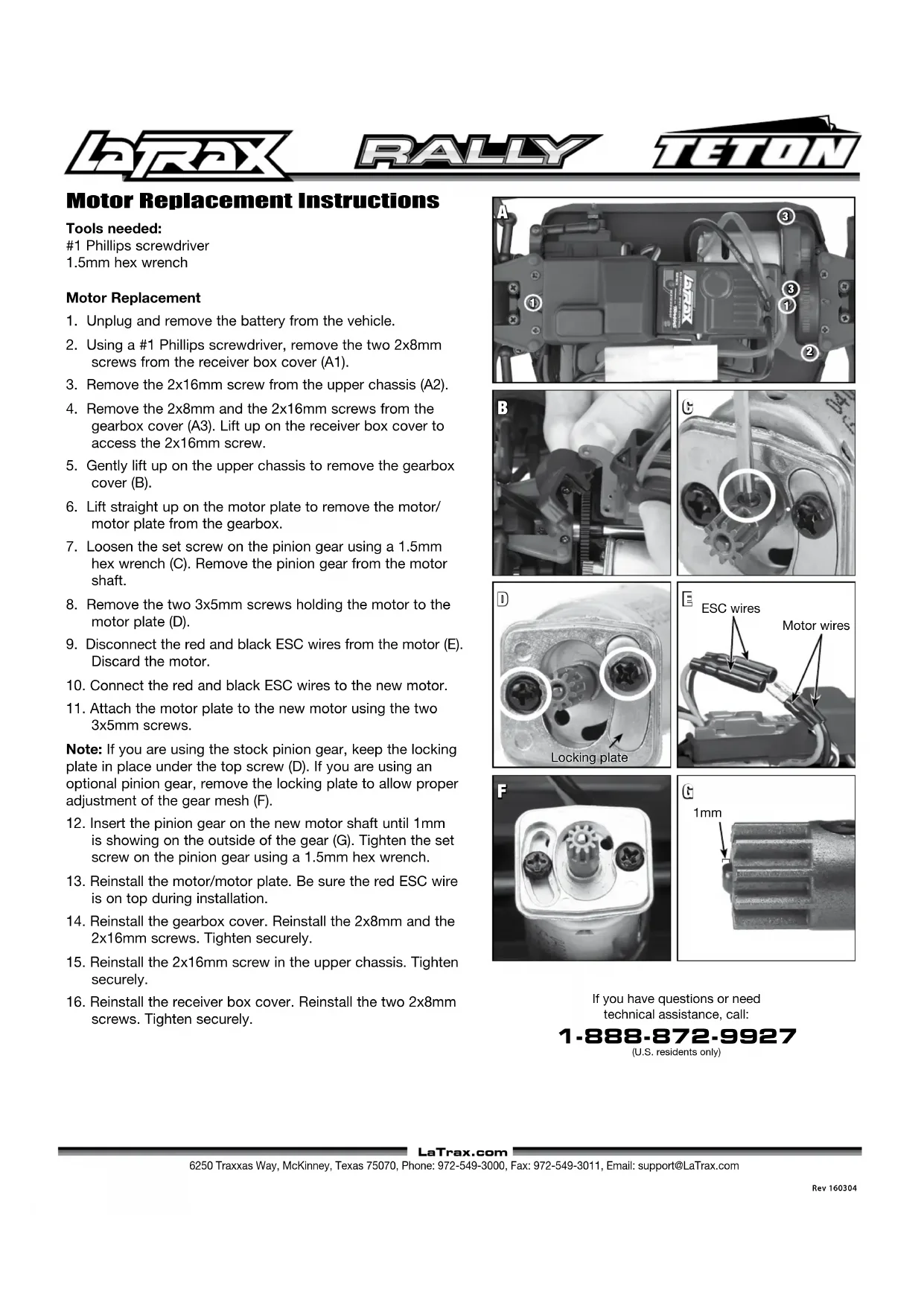 deux vis de 2x8 mm. Serrez bien. Rev 160304 Si vous avez des questions ou avez besoin d’assistance technique, communiquez avec LaTrax au : 1-888-872-9927 (uniquement les résidents des États-Unis) Outils nécessaires: Tournevis Philips no. 1 Clé Allen de 1,5 mm Consignes pour le remplacement du moteur