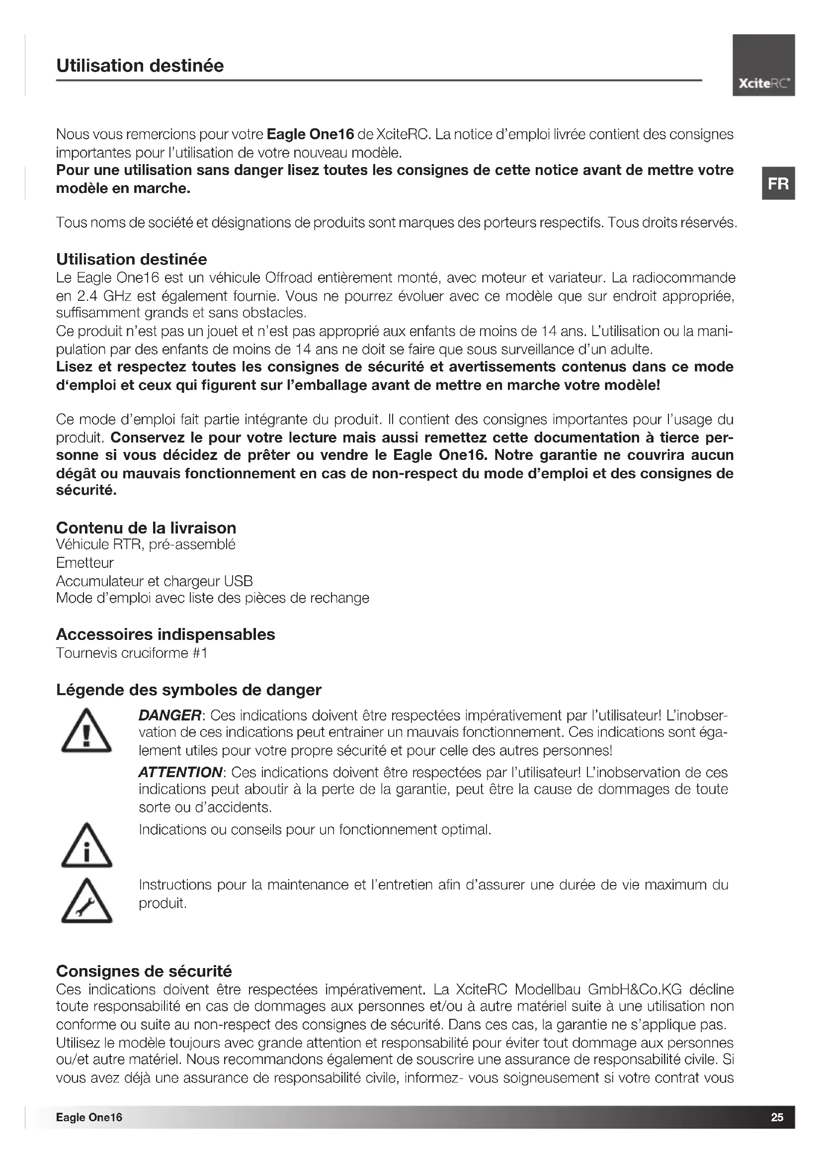vation de ces indications peut entrainer un mauvais fonctionnement. Ces indications sont éga- lement utiles pour votre propre sécurité et pour celle des autres personnes! ATTENTION: Ces indications doivent être respectées par l’utilisateur! L’inobservation de ces indications peut aboutir à la perte de la garantie, peut être la cause de dommages de toute sorte ou d’accidents. Indications ou conseils pour un fonctionnement optimal. Instructions pour la maintenance et l’entretien afin d’assurer une durée de vie maximum du produit. Consignes de sécurité Ces indications doivent être respectées impérativement. La XciteRC Modellbau GmbH&Co.KG décline toute responsabilité en cas de dommages aux personnes et/ou à autre matériel suite à une utilisation non conforme ou suite au non-respect des consignes de sécurité. Dans ces cas, la garantie ne s’applique pas. Utilisez le modèle toujours avec grande attention et responsabilité pour éviter tout dommage aux personnes ou/et autre matériel. Nous recommandons également de souscrire une assurance de responsabilité civile. Si vous avez déjà une assurance de responsabilité civile, informez- vous soigneusement si votre contrat vous26 Eagle One16