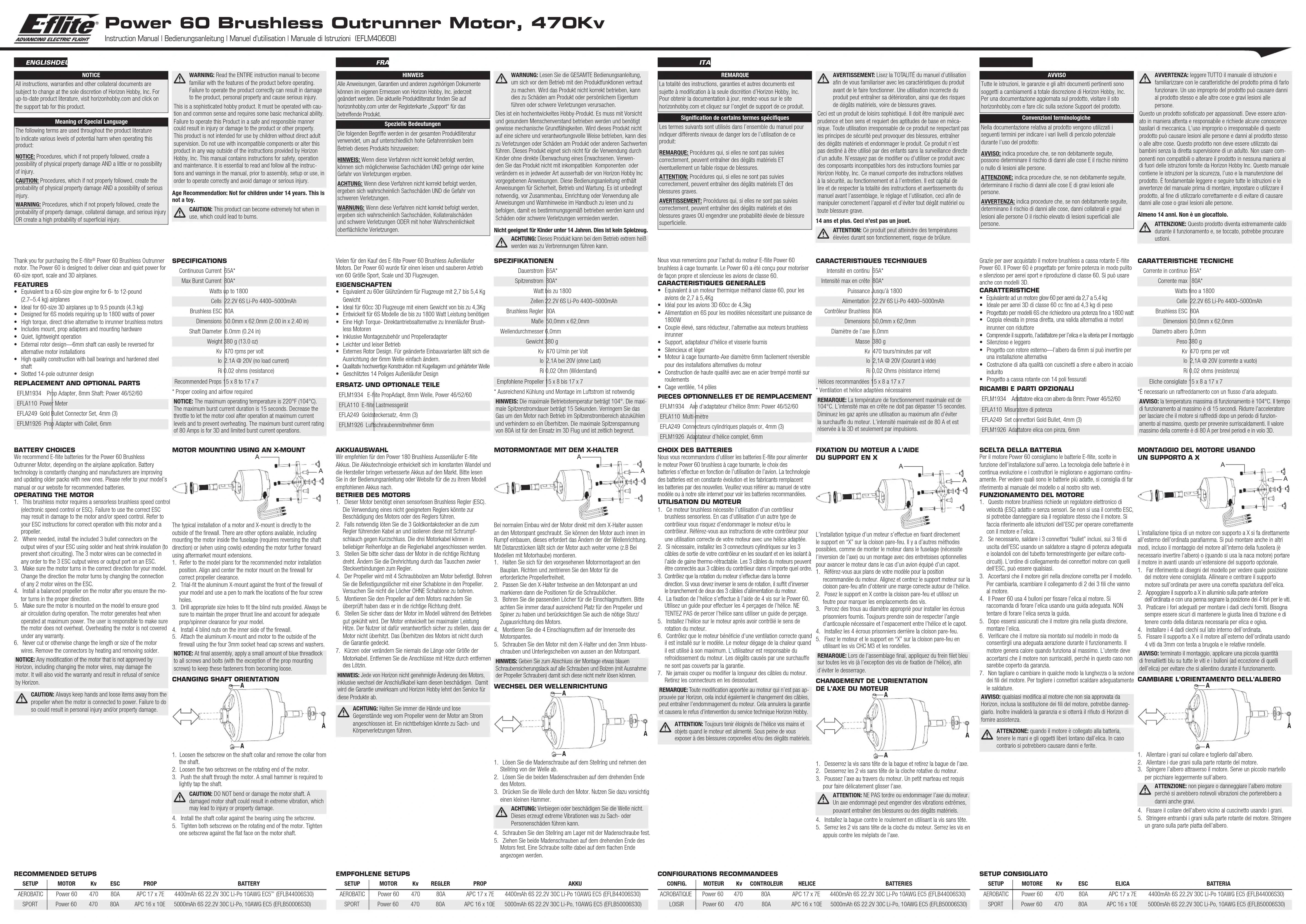 Power 60 Brushless Outrunner Motor, 470Kv Instruction Manual | Bedienungsanleitung | Manuel d’utilisation | Manuale di Istruzioni (EFLM4060B) Nous vous remercions pour l’achat du moteur E-flite Power 60 brushless à cage tournante. Le Power 60 a été conçu pour motoriser de façon propre et silencieuse les avions de classe 60. CARACTERISTIQUES GENERALES