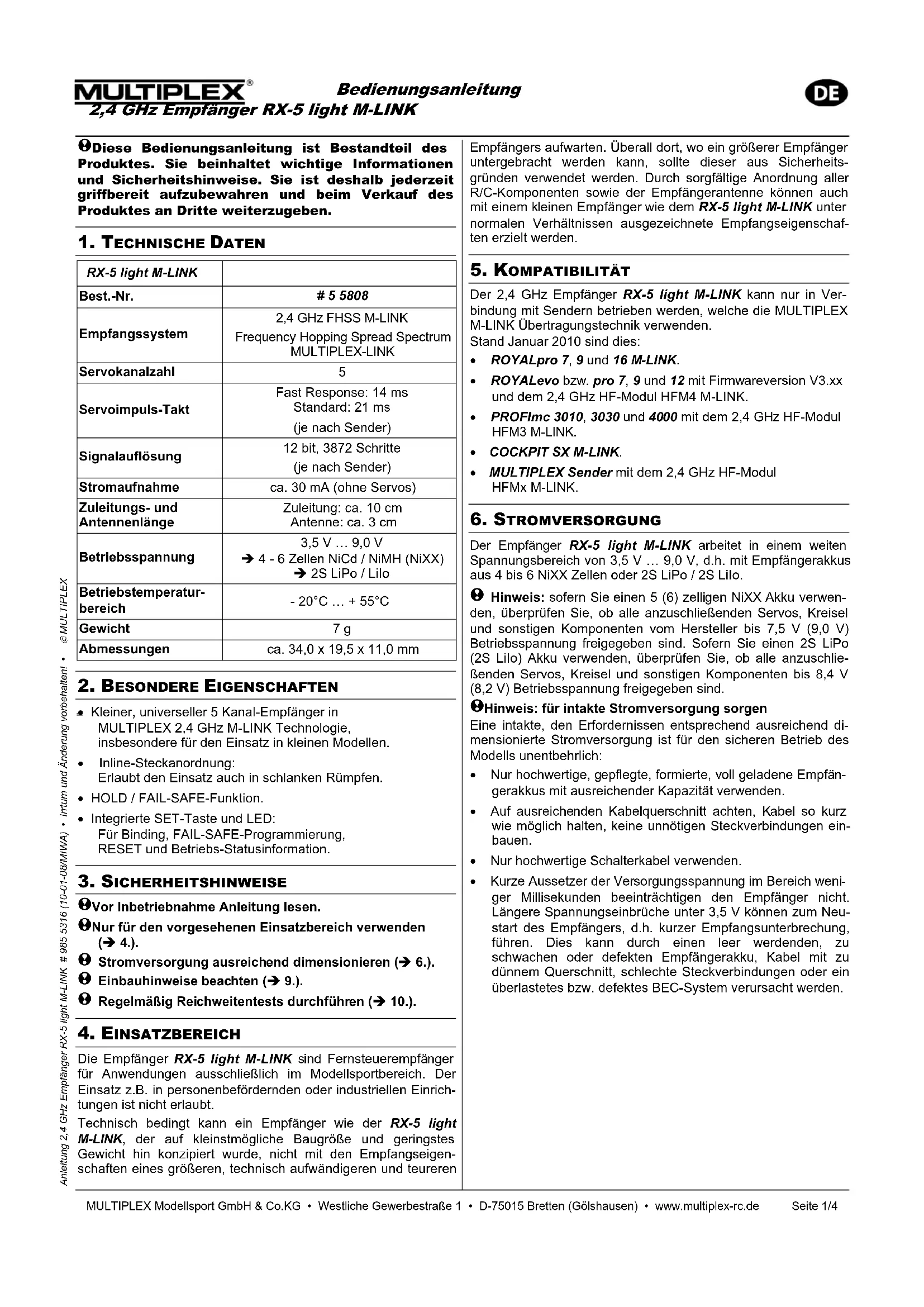 N’effectuez ce test uniquement si aucun autre émetteur en marche se trouve dans les environs.Notice d’utilisation du récepteur 2,4 GHz RX-5 light M-LINK MULTIPLEX Modellsport GmbH & Co.KG • Westliche Gewerbestraße 1 • D-75015 Bretten (Gölshausen) • www.multiplex-rc.de Page 4/4 Notice d’utilisation du récepteur 2,4 GHz RX-5 light M-LINK # 985 5316 (10-01-08/MIWA) • Sous réserve de toute erreur ou modification! •