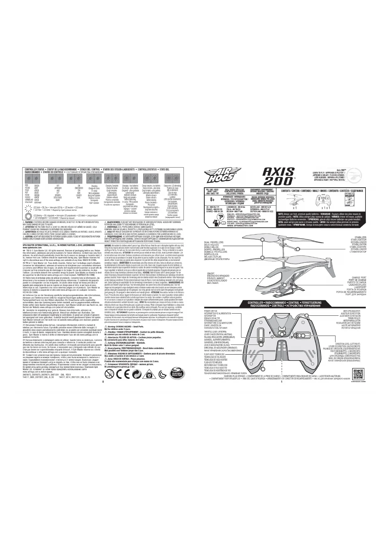 Emplacement – Faire voler l’hélicoptère dans une grande pièce ne comportant pas d’objet fragile. Éviter de faire voler l’AXIS 200™ près d’un évent et/ou d’un ventilateur, cela pourrait le rendre difficile à contrôler. REMARQUE : Toujours demander la permission avant de faire voler l’AXIS 200™ à l’intérieur. MISE EN GARDE : Ne jamais faire voler près du visage. Toujours garder le rotor à l’écart des doigts, des cheveux, des yeux ou d’autres parties du corps. Toujours décoller à partir d’une surface plane. Ne jamais tenir l’hélicoptère dans les mains lors du décollage. NE PAS faire décoller l’hélicoptère à proximité de personnes ou d’animaux. Se tenir à distance des obstacles et de tout danger électrique. En cas de problème, consulter la section « DÉPANNAGE » du site Internet sur : www.airhogs.com REMARQUE : De fortes interférences électromagnétiques peuvent perturber ou interrompre le fonctionnement normal du produit. Pour le réinitialiser, l’éteindre complètement et le rallumer. Si le produit ne fonctionne toujours pas normalement, changer de lieu d’utilisation et réessayer. Des piles faibles peuvent empêcher le produit de fonctionner correctement. Pour des performances optimales, remplacer les piles. Mesures de sécurité : - S’assurer que les mains, cheveux et vêtements ne se trouvent pas à proximité des hélices lorsque le jouet est en marche. - Éteindre la radiocommande et le jouet lorsqu’ils ne sont pas utilisés. - Retirer les piles de la radiocommande lorsqu’elle n’est pas utilisée. - La surveillance des parents est recommandée pendant l'utilisation. - Toujours garder jouet dans le champ de vision pour le surveiller à tout moment. - Pour des performances optimales, il est recommandé d’utiliser des piles alcalines neuves dans la radiocommande. - Les utilisateurs du produit doivent scrupuleusement respecter les consignes de ce mode d’emploi. - La radiocommande/chargeur a été conçue spécialement pour être utilisée avec la batterie rechargeable LiPo de l'AXIS 200™. Ne pas l’utiliser pour recharger une batterie différente de celle de l'AXIS 200™. Remarque : Il est recommandé aux parents d’aider les enfants lors de l’installation et du remplacement des piles. Les décharges électrostatiques peuvent perturber le fonctionnement du jouet et conduire l’utilisateur à le réinitialiser. Remarque à l’attention des adultes : Vérifier régulièrement que la prise, la structure et les autres pièces ne comportent aucun dommage. Dans le cas contraire, le jouet et la radiocommande ne doivent pas être utilisés jusqu’à ce qu'ils soient réparés. Ce jouet ne convient pas aux enfants de moins de 3 ans. Ce jouet ne doit être utilisé qu’avec la radiocommande recommandée. Entretien et maintenance : Toujours retirer les piles lorsque le jouet n’est pas utilisé pendant une longue période (radiocommande/chargeur uniquement). Nettoyer délicatement le jouet avec un chiffon humide et propre. Conserver le jouet à l’écart de toute source de chaleur. Ne pas plonger le jouet dans l’eau ; les composants électroniques risqueraient d’être endommagés. L'AXIS 200™fonctionne avec une batterie au lithium polymère. INSTRUCTIONS SPÉCIALES CONCERNANT LA BATTERIE LiPo : - Toujours surveiller la batterie lors de la mise en charge. - Recharger la batterie sur une surface isolée. Maintenir à l’écart de tout matériau inflammable. - Ne pas exposer aux rayons directs du soleil. La batterie peut exploser, surchauffer, ou prendre feu. - Ne pas démonter, modifier, chauffer ou court-circuiter. Ne pas jeter au feu ni entreposer dans un endroit chaud. Ne pas faire tomber la batterie ni lui faire subir d’impacts. - Ne pas mouiller la batterie. - Ne recharger la batterie qu’avec le chargeur indiqué par Spin Master™. - N’utiliser la batterie que dans l’appareil indiqué par Spin Master™. - Lire attentivement le mode d’emploi et utiliser correctement la batterie. - En cas de fuite ou d’explosion, utiliser du sable ou un extincteur chimique. - Les piles doivent être correctement recyclées ou éliminées.INFORMATIONS DE SÉCURITÉ CONCERNANT LES PILES : Fonctionne avec 4 piles alcalines AA 1,5 V (non fournies). - Les piles sont de petits objets. - Le remplacement des piles doit être effectué par un adulte. - Respecter le schéma de polarité (+/-) du compartiment des piles. - Retirer immédiatement toute pile usagée du jouet. - Jeter correctement les piles usagées. - Retirer les piles du jouet en cas d’inutilisation prolongée. - N’utiliser que des piles d’un même type ou d’un type équivalent à celui recommandé. - NE PAS incinérer les piles usagées. - NE PAS jeter les piles au feu ; elles pourraient exploser ou fuir. - NE PAS mélanger des piles neuves et des piles usagées, ou des piles de types différents (ex : alcalines/standard). - NE PAS utiliser de piles rechargeables. - NE PAS recharger des piles non rechargeables. - NE PAS court-circuiter les bornes d’alimentation. INSTRUCTIONS CONCERNANT LE RETRAIT DE LA BATTERIE : La batterie interne est installée en usine. La batterie interne est installée en usine. Le démontage du produit et l’extraction de sa batterie doivent être effectués par un adulte. Ne pas utiliser d’outil pour le démontage. Éviter de tirer ou déformer le sarà stato riparato. Questo giocattolo non è adatto ai bambini di età inferiore a 3 anni. Questo giocattolo deve essere usato solo con il radiocomando consigliato. Conservazione e manutenzione: rimuovere sempre le pile dal giocattolo quando non lo si usa per un periodo prolungato (solo radiocomando/caricabatteria). Pulire il giocattolo strofinandolo delicatamente con un panno pulito umido. Tenere il giocattolo lontano da fonti di calore dirette. Non immergere il giocattolo in acqua. Ciò potrebbe causare danni ai componenti elettronici.AXIS 200™ è dotato di una b