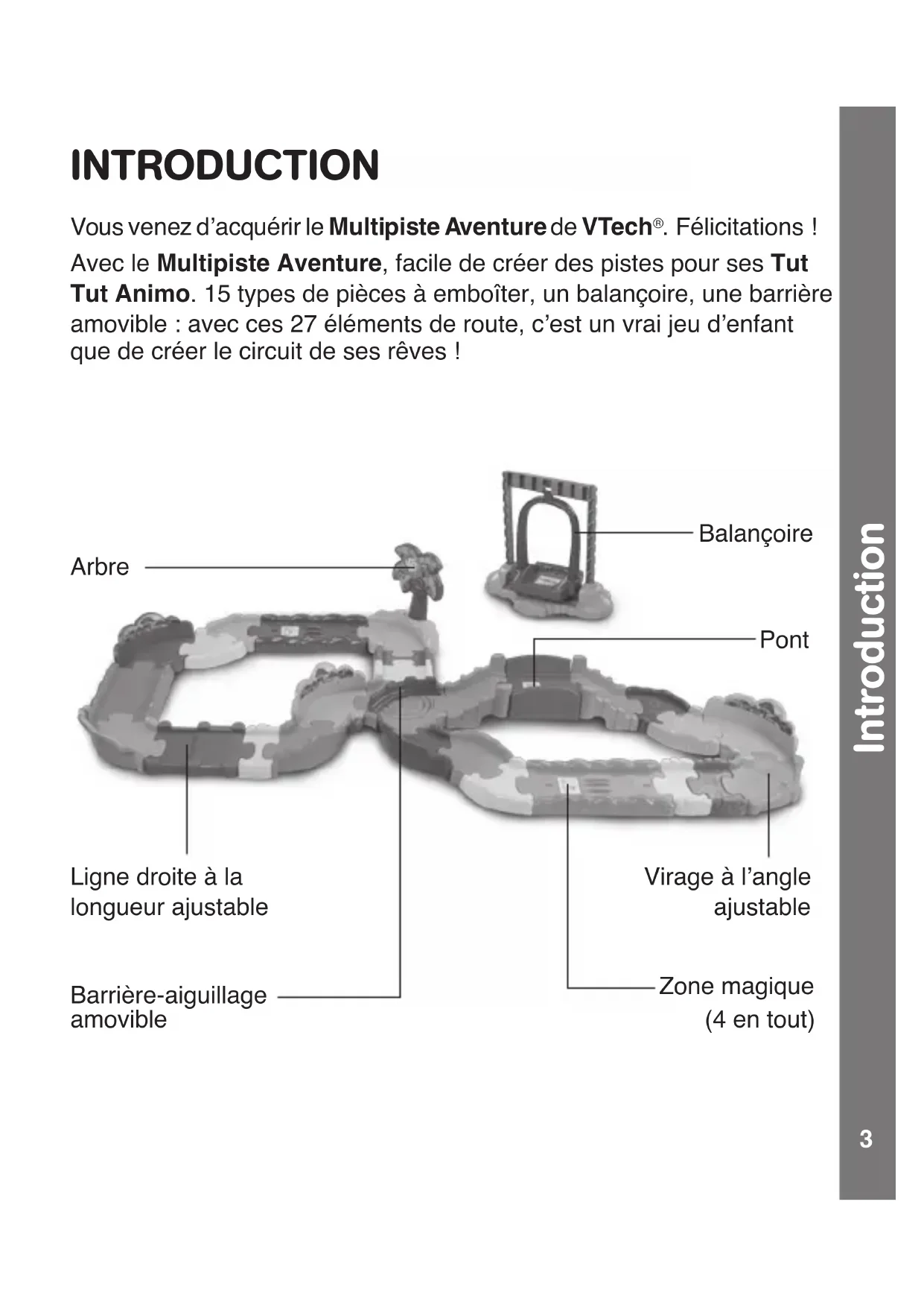 Vous venez d'acquérir le Multipiste Aventure de VTech®. Félicitations ! Avec le Multipiste Aventure, il est facile de créer des pistes pour ses Tut Tut Animo. 15 types de pièces à emboîter, un balançoire, une barrière amovible : avec ces 27 éléments de route, c'est un vrai jeu d'enfant que de créer le circuit de ses rêves !
