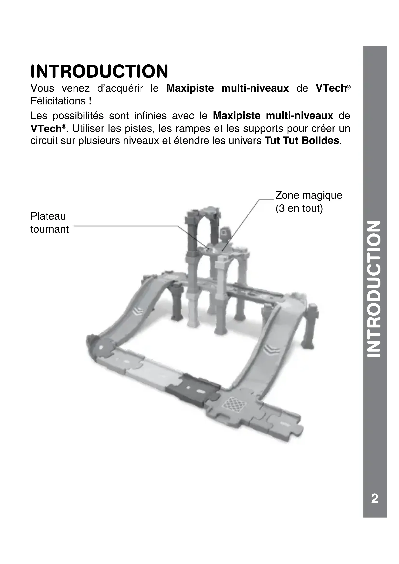 Manuel d’utilisation Maxipiste multi-niveaux © 2016 VTech Tous droits réservés Imprimé en Chine 91-003233-009 FR2 INTRODUCTION Vous venez d’acquérir le Maxipiste multi-niveaux de VTech