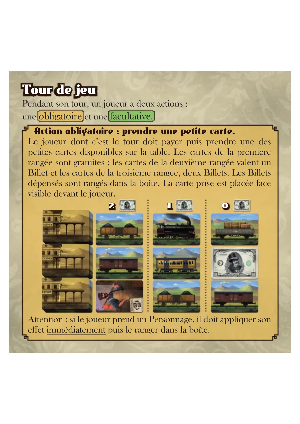Le joueur dont c'est le tour doit payer puis prendre une des petites cartes disponibles sur la table. Les cartes de la première rangée sont gratuites ; les cartes de la deuxième rangée valent un Billet et les cartes de la troisième rangée, deux Billets. Les Billets dépensés sont rangés dans la boîte. La carte prise est placée face visible devant le joueur.