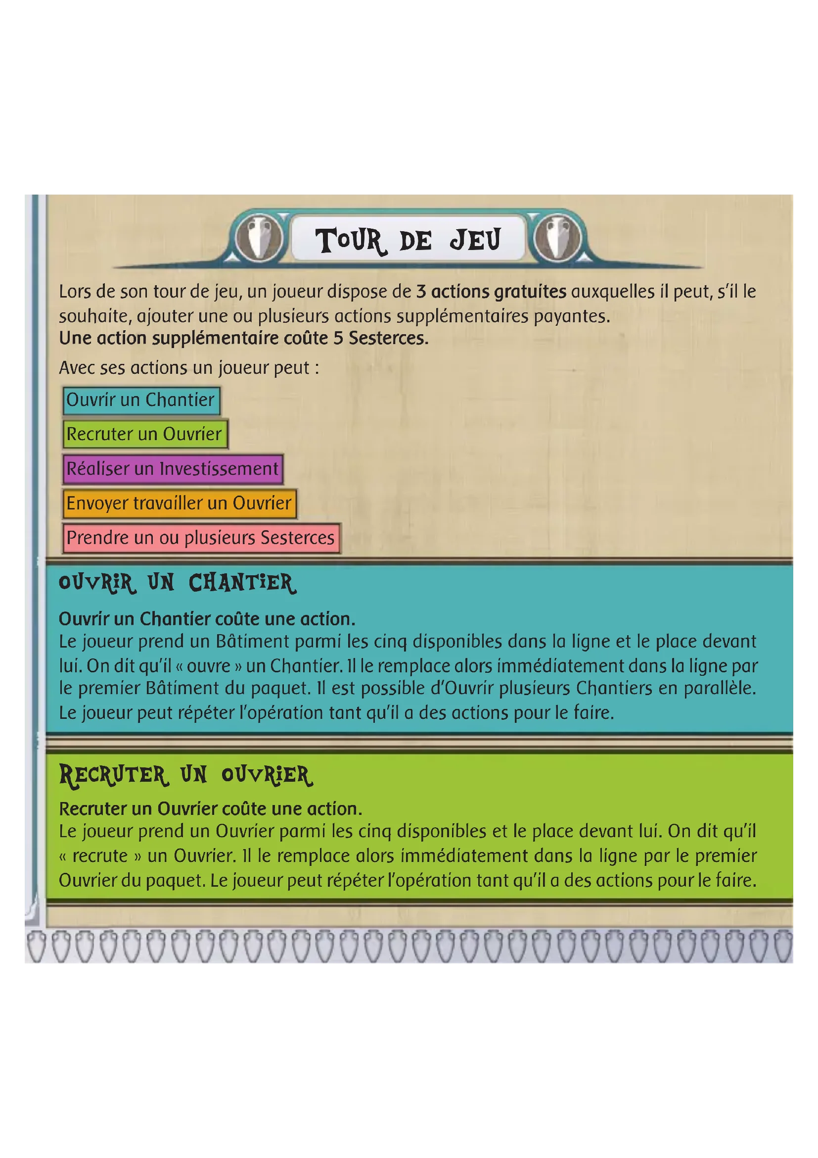 Lors de son tour de jeu, un joueur dispose de 3 actions gratuites auxquelles il peut, s'il le souhaite, ajouter une ou plusieurs actions supplémentaires payantes. Une action supplémentaire copte 5 Sesterces.