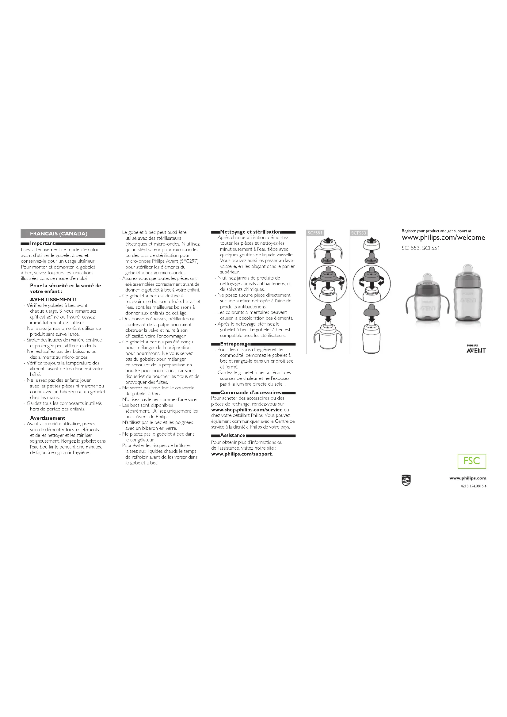 FRANÇAIS (CANADA) Important Lisez attentivement ce mode d’emploi avant d’utiliser le gobelet à bec et conservez-le pour un usage ultérieur. Pour monter et démonter le gobelet à bec, suivez toujours les indications illustrées dans ce mode d’emploi. Pour la sécurité et la santé de votre enfant : AVERTISSEMENT! - Vériez le gobelet à bec avant chaque usage. Si vous remarquez qu’il est abîmé ou ssuré, cessez immédiatement de l’utiliser. - Ne laissez jamais un enfant utiliser ce produit sans surveillance. - Siroter des liquides de manière continue et prolongée peut abîmer les dents. - Ne réchauffez pas des boissons ou des aliments au micro-ondes. - Vériez toujours la température des aliments avant de les donner à votre bébé. - Ne laissez pas des enfants jouer avec les petites pièces ni marcher ou courir avec un biberon ou un gobelet dans les mains. - Gardez tous les composants inutilisés hors de portée des enfants. Avertissement - Avant la première utilisation, prenez soin de démonter tous les éléments et de les nettoyer et les stériliser soigneusement. Plongez le gobelet dans l’eau bouillante pendant cinq minutes, de façon à en garantir l’hygiène. - Le gobelet à bec peut aussi être utilisé avec des stérilisateurs électriques et micro-ondes. N’utilisez qu’un stérilisateur pour micro-ondes ou des sacs de stérilisation pour micro-ondes Philips Avent (SFC297) pour stériliser les éléments du gobelet à bec au micro-ondes. - Assurez-vous que toutes les pièces ont été assemblées correctement avant de donner le gobelet à bec à votre enfant. - Ce gobelet à bec est destiné à recevoir une boisson diluée. Le lait et l’eau sont les meilleures boissons à donner aux enfants de cet âge. - Des boissons épaisses, pétillantes ou contenant de la pulpe pourraient obstruer la valve et nuire à son efcacité, voire l’endommager. - Ce gobelet à bec n’a pas été conçu pour mélanger de la préparation pour nourrissons. Ne vous servez pas du gobelet pour mélanger en secouant de la préparation en poudre pour nourrissons, car vous risqueriez de boucher les trous et de provoquer des fuites. - Ne serrez pas trop fort le couvercle du gobelet à bec. - N’utilisez pas le bec comme d’une suce. - Les becs sont disponibles séparément. Utilisez uniquement les becs Avent de Philips. - N’utilisez pas le bec et les poignées avec un biberon en verre. - Ne placez pas le gobelet à bec dans le congélateur. - Pour éviter les risques de brûlures, laissez aux liquides chauds le temps de refroidir avant de les verser dans le gobelet à bec. Nettoyage et stérilisation - Après chaque utilisation, démontez toutes les pièces et nettoyez-les minutieusement à l’eau tiède avec quelques gouttes de liquide vaisselle. Vous pouvez aussi les passer au lave- vaisselle, en les plaçant dans le panier supérieur. - N’utilisez jamais de produits de nettoyage abrasifs antibactériens, ni de solvants chimiques. - Ne posez aucune pièce directement sur une surface nettoyée à l’aide de produits antibactériens. - Les colorants alimentaires peuvent causer la décoloration des éléments. - Après le nettoyage, stérilisez le gobelet à bec. Le gobelet à bec est compatible avec les stérilisateurs. Entreposage - Pour des raisons d’hygiène et de commodité, démontez le gobelet à bec et rangez-le dans un endroit sec et fermé. - Gardez le gobelet à bec à l’écart des sources de chaleur et ne l’exposez pas à la lumière directe du soleil. Commande d’accessoires Pour acheter des accessoires ou des pièces de rechange, rendez-vous sur www.shop.philips.com/service ou chez votre détaillant Philips. Vous pouvez également communiquer avec le Centre de service à la clientèle Philips de votre pays. Assistance Pour obtenir plus d’informations ou de l’assistance, visitez notre site : www.philips.com/support. SCF553, SCF551 Register your product and get support at www.philips.com/welcome