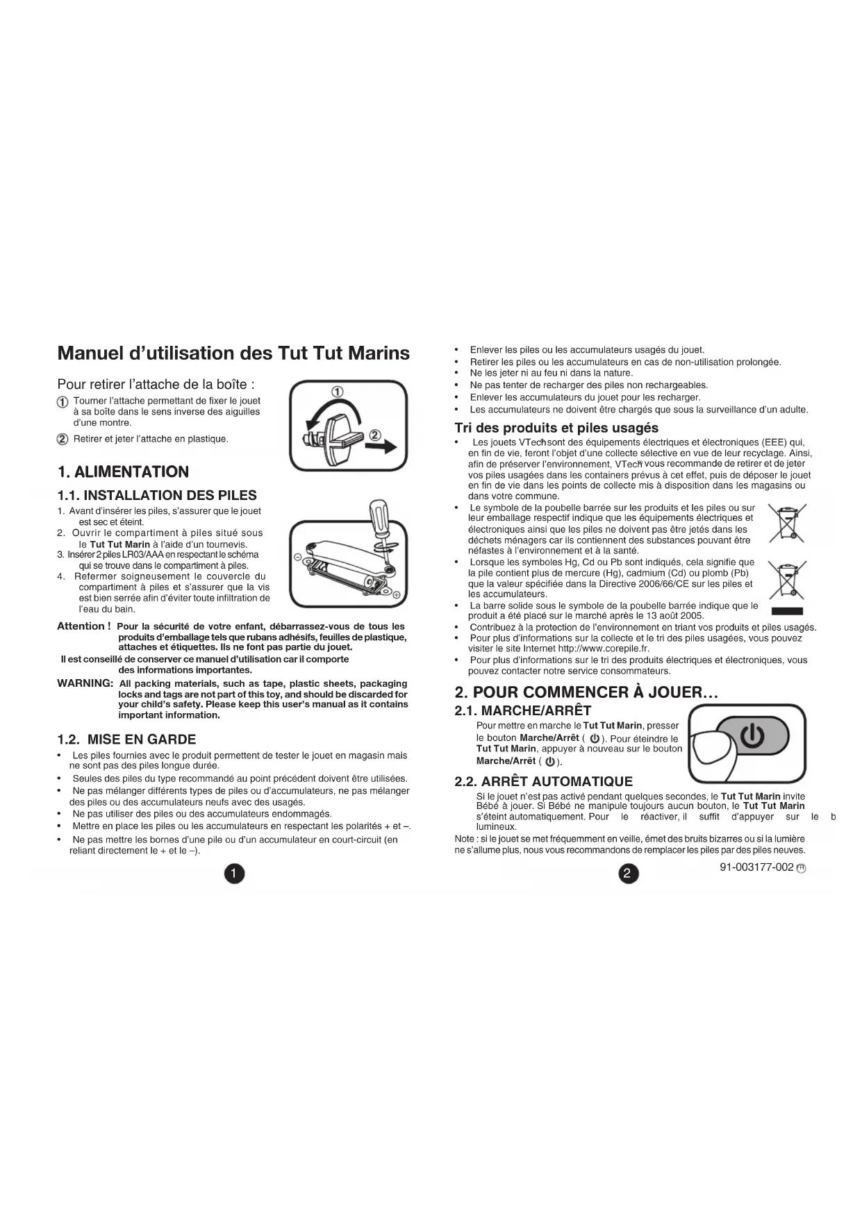 1. Avant d’insérer les piles, s’assurer que le jouet est sec et éteint. 2. Ouvrir le compartiment à piles situé sous le Tut Tut Marin à l’aide d’un tournevis.3. Insérer 2 piles LR03/AAA en respectant le schéma qui se trouve dans le compartiment à piles.4. Refermer soigneusement le couvercle du compartiment à piles et s’assurer que la vis est bien serrée afin d’éviter toute infiltration de l’eau du bain. Attention ! Pour la sécurité de votre enfant, débarrassez-vous de tous les produits d’emballage tels que rubans adhésifs, feuilles de plastique, attaches et étiquettes. Ils ne font pas partie du jouet. Il est conseillé de conserver ce manuel d’utilisation car il comporte des informations importantes.WARNING: All packing materials, such as tape, plastic sheets, packaging locks and tags are not part of this toy, and should be discarded for your child’s safety. Please keep this user’s manual as it contains important information.