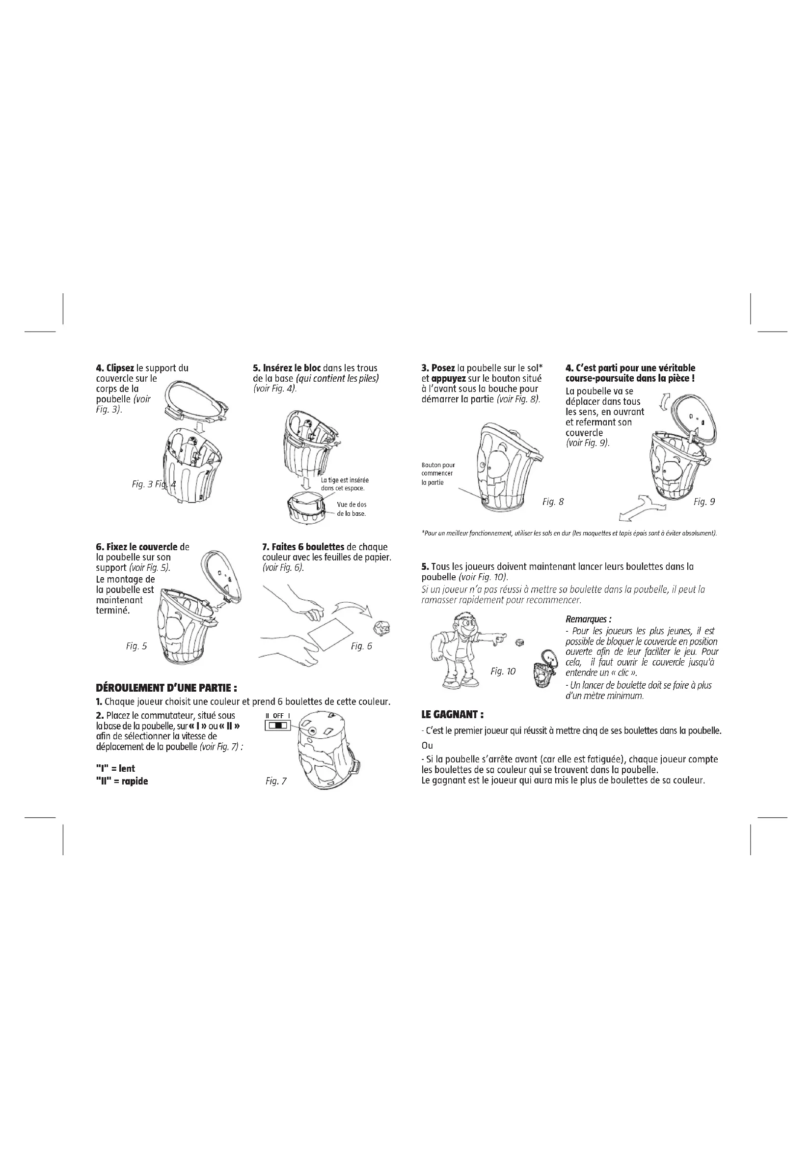 la base de la poubelle, sur « I » ou « II » afin de sélectionner la vitesse de déplacement de la poubelle (voir Fig. 7) : "I" = lent "II" = rapideCONTENU : 1 poubelle à moteur* à assembler, 24 feuilles de papier (4 couleurs différentes) et une notice. *Fonctionne avec 4 piles AA non fournies BEN BOULETTE a été conçu pour apprendre aux enfants à mettre les papiers à la poubelle. BEN BOULETTE adore jouer des tours et compliquer la tâche des enfants car il ne reste pas en place. En plus, son couvercle n'est pas ouvert en permanence ! BUT DU JEU : Mettre les boulettes de papier de sa couleur dans la poubelle. MISE EN PLACE DU JEU :