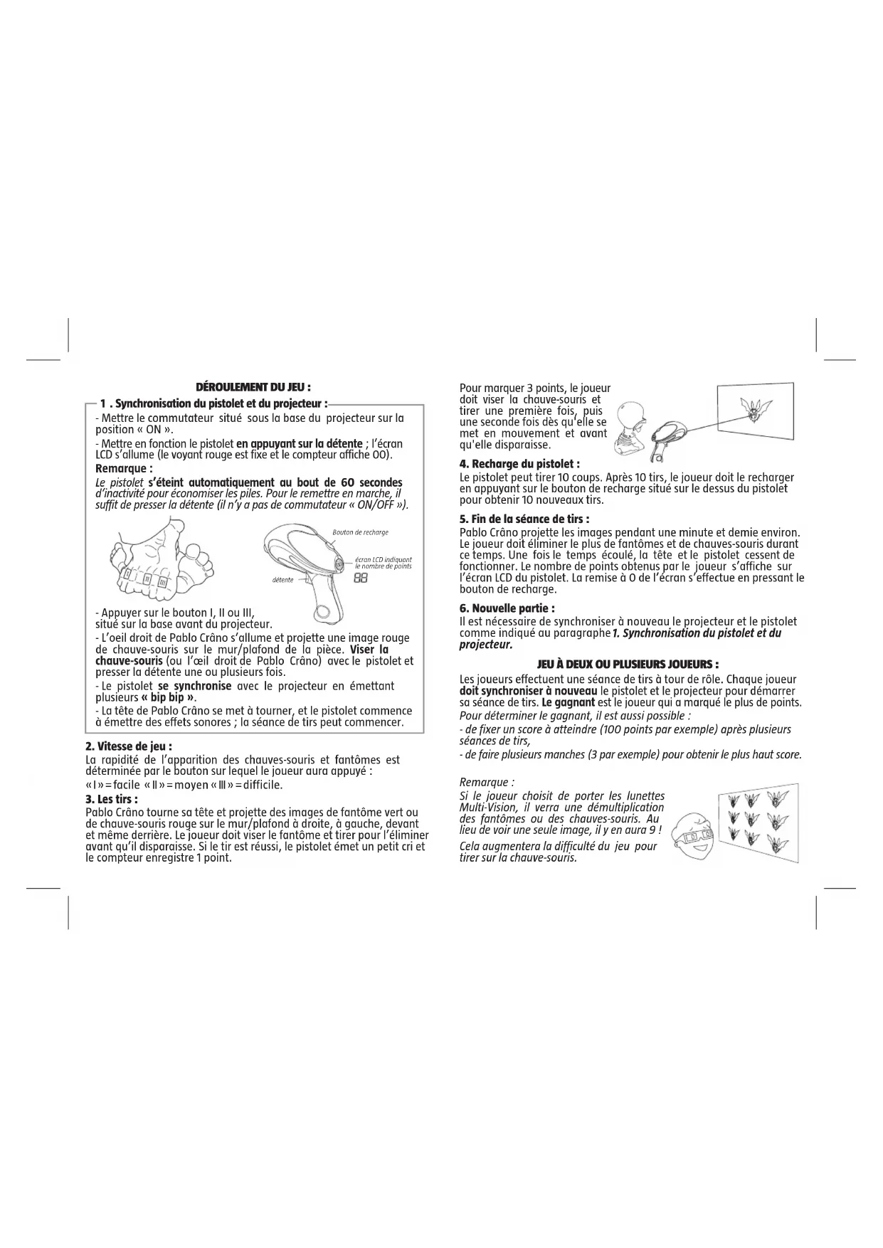 projecteur. JEU À DEUX OU PLUSIEURS JOUEURS : Les joueurs effectuent une séance de tirs à tour de rôle. Chaque joueur doit synchroniser à nouveau le pistolet et le projecteur pour démarrer sa séance de tirs. Le gagnant est le joueur qui a marqué le plus de points. Pour déterminer le gagnant, il est aussi possible : - de fixer un score à atteindre (100 points par exemple) après plusieurs séances de tirs, - de faire plusieurs manches (3 par exemple) pour obtenir le plus haut score. Remarque : Si le joueur choisit de porter les lunettes Multi-Vision, il verra une démultiplication des fantômes ou des chauves-souris. Au lieu de voir une seule image, il y en aura 9 ! Cela augmentera la difficulté du jeu pour tirer sur la chauve-souris.