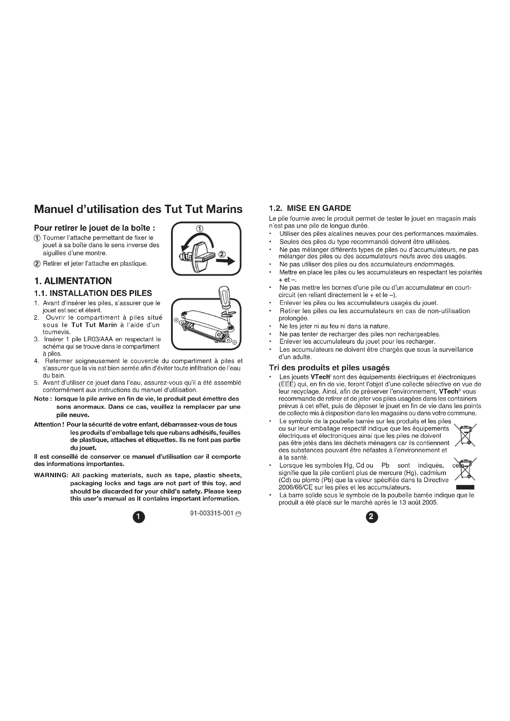 1. Avant d’insérer les piles, s’assurer que le jouet est sec et éteint. 2. Ouvrir le compartiment à piles situé sous le Tut Tut Marin à l’aide d’un tournevis.3. Insérer 1 pile LR03/AAA en respectant le schéma qui se trouve dans le compartiment à piles.4. Refermer soigneusement le couvercle du compartiment à piles et s’assurer que la vis est bien serrée afin d’éviter toute infiltration de l’eau du bain. 5. Avant d’utiliser ce jouet dans l’eau, assurez-vous qu’il a été assemblé conformément aux instructions du manuel d’utilisation.Note : lorsque la pile arrive en fin de vie, le produit peut émettre des sons anormaux. Dans ce cas, veuillez la remplacer par une pile neuve.Attention ! Pour la sécurité de votre enfant, débarrassez-vous de tous les produits d’emballage tels que rubans adhésifs, feuilles de plastique, attaches et étiquettes. Ils ne font pas partie du jouet. Il est conseillé de conserver ce manuel d’utilisation car il comporte des informations importantes.WARNING: All packing materials, such as tape, plastic sheets, packaging locks and tags are not part of this toy, and should be discarded for your child’s safety. Please keep this user’s manual as it contains important information.