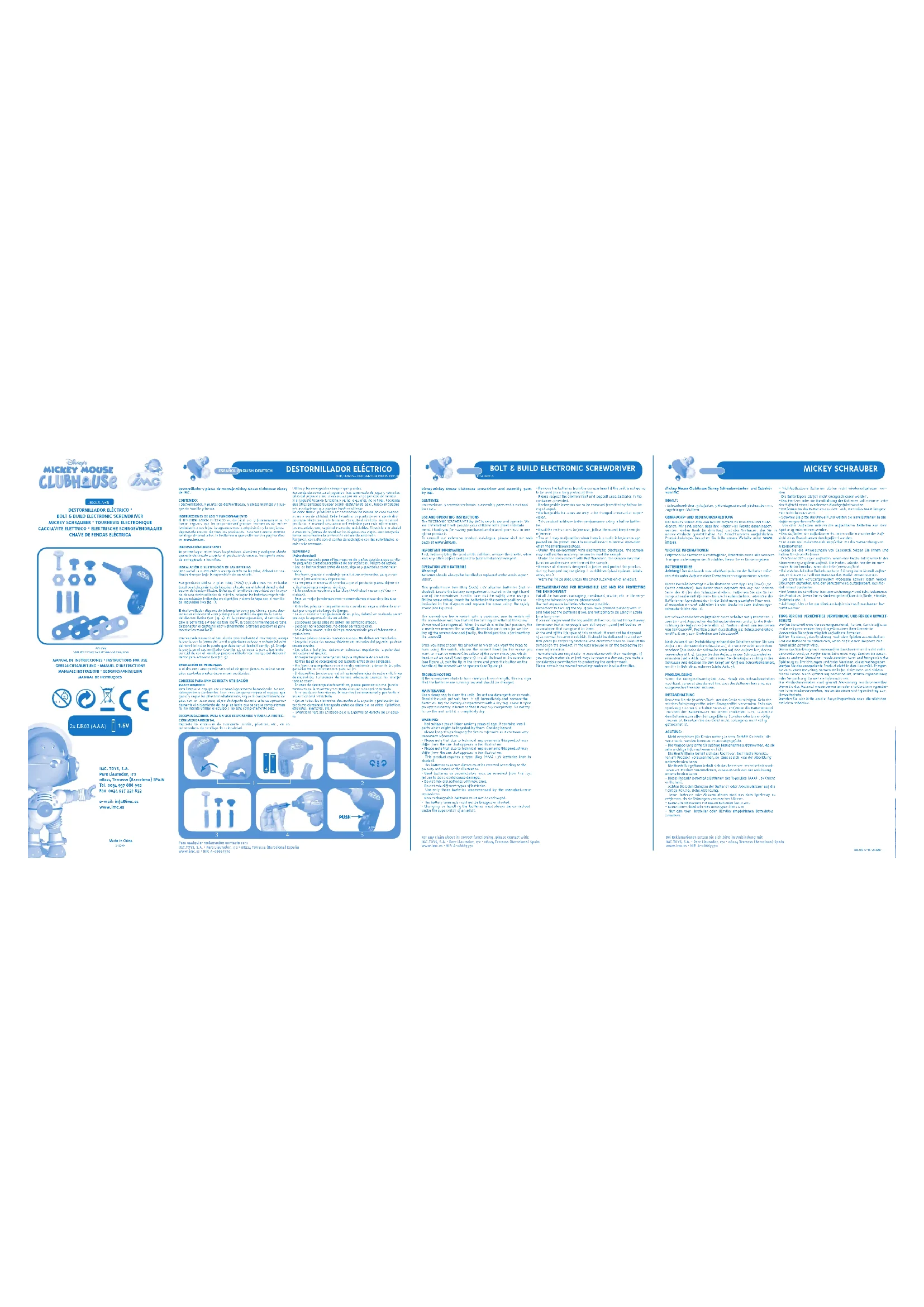 ET POUR LA PROTECTION DE L’ENVIRONNEMENT Déposez les emballages de transport, les cartons, les em- ballages plastique, etc., dans les conteneurs de recyclage de votre localité. Utilisez de préférence des piles rechargeables. Débranchez le jouet après utilisation et retirez les piles si vous avez l’intention de ne pas utiliser le jouet pendant une longue période. Si le jouet fonctionne encore et que vous n’en voulez plus, ne le jetez pas. Pensez que d’autres personnes pourront encore l’utiliser et s’amuser avec ce jouet ; recherchez des entités et/ou des associations susceptibles de le leur faire parvenir. Ne pas jeter ce produit dans une poubelle normale lorsque vous voulez vous en débarrasser. Il doit être déposé dans un centre de recueil pour le recyclage des appareils électri- ques et électroniques. Consultez le symbole sur le produit, dans le manuel d’utilisation ou sur l’emballage pour plus d’informations. Les matériaux sont recyclables, conformément au marqua- ge du produit. Vous faites une importante contribution à la protection de notre environnement quand vous recyclez le matériel ou quand vous trouvez d’autres formes d’utilisa- tion des vieux appareils. Veuillez contacter votre centre de recyclage le plus proche ou les autorités locales. Cacciavite e pezzi per il montaggio Mickey Mouse ClubHouse Disney di IMC. CONTENUTO: 1 cacciavite, 3 punte per cacciavite, 3 pezzi per il montag- gio e 3 giochi di vite e dado. ISTRUZIONI PER L‘USO E IL FUNZIONAMENTO Lo CACCIAVITE ELETTRICO di IMC è semplice da utilizzare e siamo sicuri che regalerà ai vostri bambini momenti di grande divertimento. Vi ringraziamo per la fiducia che ci avete accordato acquistando uno dei nostri prodotti. Per conoscere il nostro catalogo completo vi invitiamo a visita- re il nostro sito Web all‘indirizzo www.imc.es. INFORMAZIONI IMPORTANTI Prima di dare il giocattolo in mano ai bambini, rimuovere tutti i componenti in plastica, fili metallici e altri oggetti che sono stati utilizzati per fermare il prodotto durante il trasporto.