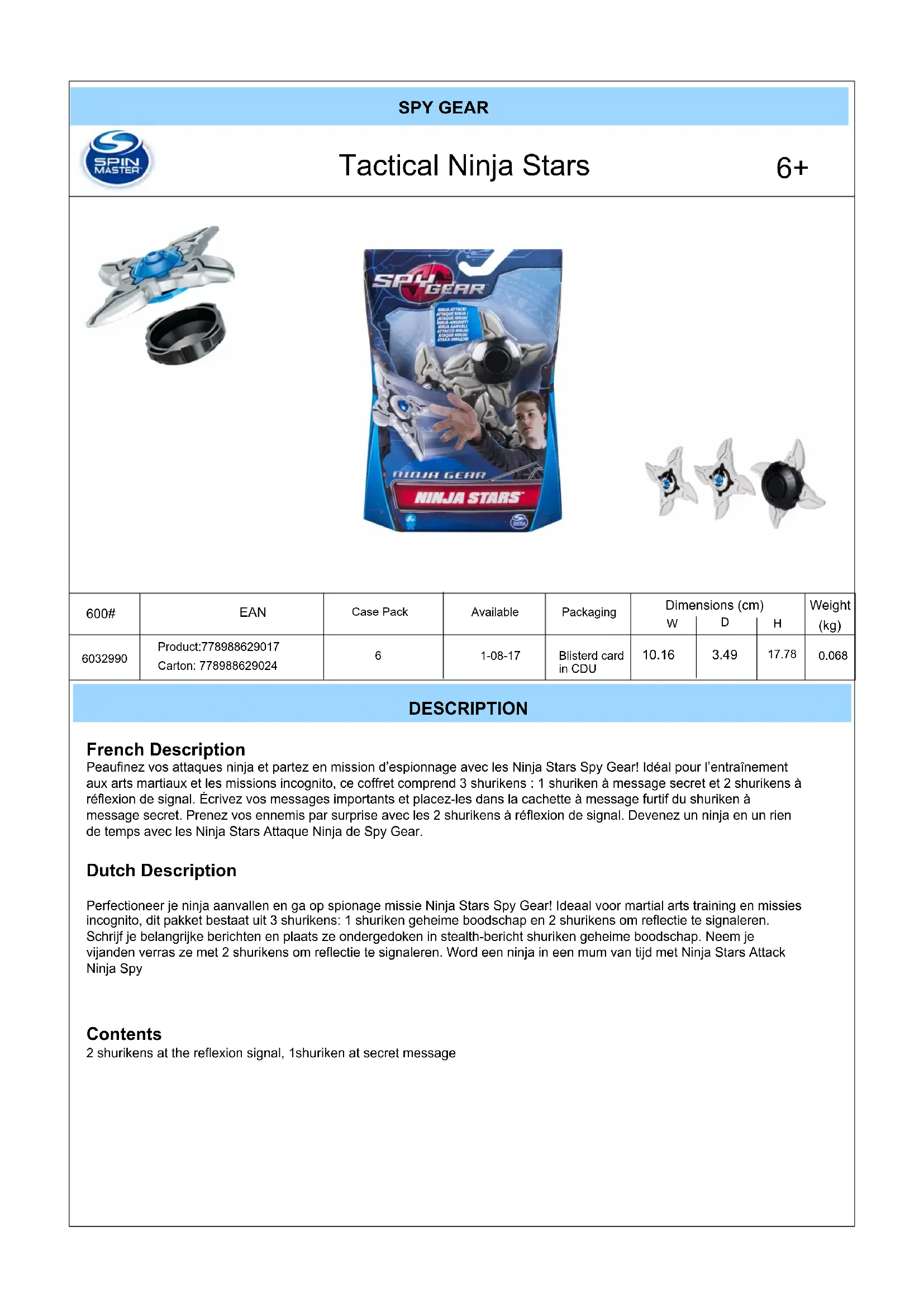 French Description Peaufinez vos attaques ninja et partez en mission d’espionnage avec les Ninja Stars Spy Gear! Idéal pour l’entraînement aux arts martiaux et les missions incognito, ce coffret comprend 3 shurikens : 1 shuriken à message secret et 2 shurikens à réflexion de signal. Écrivez vos messages importants et placez-les dans la cachette à message furtif du shuriken à message secret. Prenez vos ennemis par surprise avec les 2 shurikens à réflexion de signal. Devenez un ninja en un rien de temps avec les Ninja Stars Attaque Ninja de Spy Gear. Dutch Description Perfectioneer je ninja aanvallen en ga op spionage missie Ninja Stars Spy Gear! Ideaal voor martial arts training en missies incognito, dit pakket bestaat uit 3 shurikens: 1 shuriken geheime boodschap en 2 shurikens om reflectie te signaleren. Schrijf je belangrijke berichten en plaats ze ondergedoken in stealth-bericht shuriken geheime boodschap. Neem je vijanden verras ze met 2 shurikens om reflectie te signaleren. Word een ninja in een mum van tijd met Ninja Stars Attack Ninja Spy Contents 2 shurikens at the reflexion signal, 1shuriken at secret message