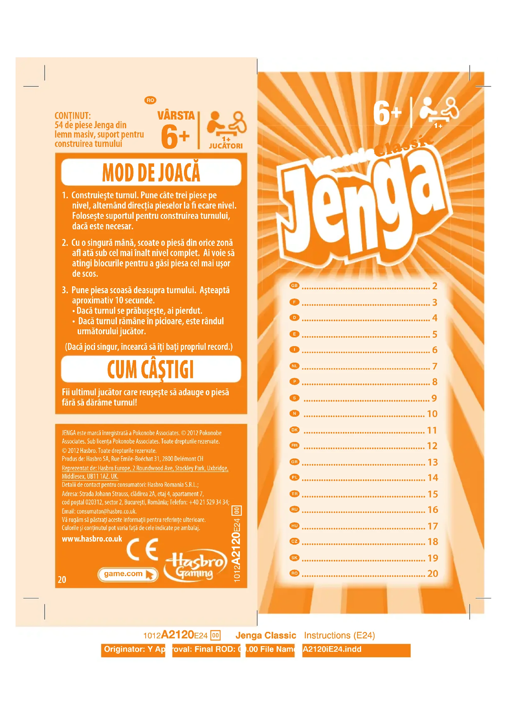 LE GAGNANT JENGA is a registered trademark of Pokonobe Associates. © 2012 Pokonobe Associates. Used under license from Pokonobe Associates. All Rights Reserved. © 2012 Hasbro. Tous droits réservés.Fabriqué par : Hasbro SA, Rue Emile-Boéchat 31, 2800 Delémont CHReprésenté par : Hasbro Europe, 2 Roundwood Ave, Stockley Park, Uxbridge, Middlesex, UB11 1AZ. UK.Service Consommateurs : Hasbro France S.A.S. 10 rue de Valence 57150 CREUTZWALD FR 03.87.82.76.20 conso@hasbro.frService consommateurs / Consumentenservice: Hasbro S.A. Belgique, Industrialaan 1 B 1, 1702 Groot-Bijgaarden. Tel.: 02 467 3360. E-mail: info@hasbro.be Conservez ces informations pour pouvoir vous y référer plus tard. Couleurs et détails peuvent varier par rapport au modèle présenté.www.hasbro.fr www.hasbro.be Be the last player to stack a block without causing the tower to crash!