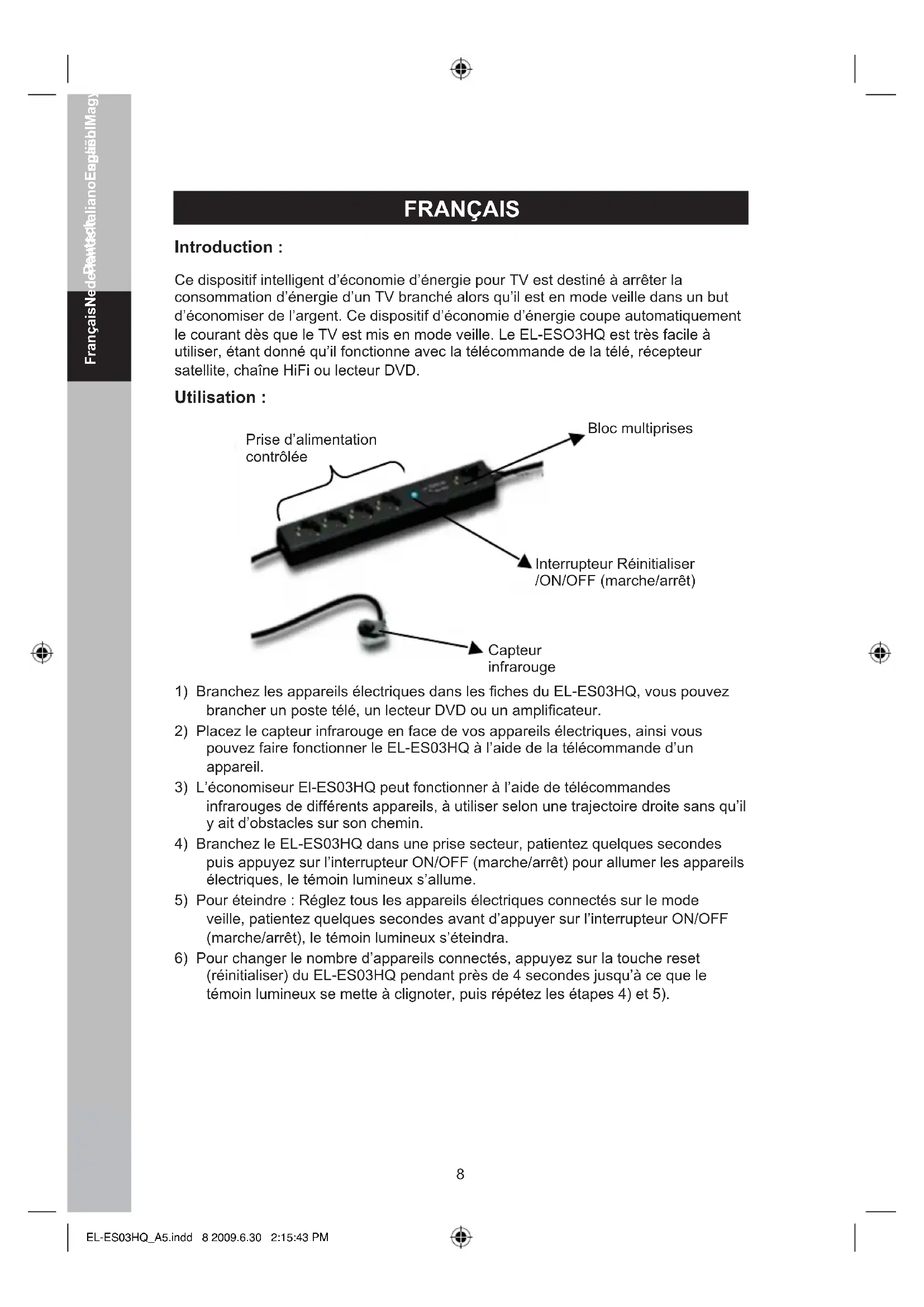 ATTENTION Des mesures de sécurité élémentaires, dont les suivantes, s’imposent lors de l’utilisation d’un dispositif d’économie électrique pour télé, an de réduire les risques d’incendie, de choc électrique et de blessures : Comprendre toutes les directives avant d’utiliser l’appareil. Pour réduire le risque de choc électrique, ce produit ne doit être ouvert que par un technicien qualié si une réparation s’impose. Débranchez l’appareil et les autres équipements du secteur s’il y a un problème. Ne pas exposer l’appareil à l’eau ni à l’humidité. Cet appareil ne devra être branché que sur le type de source d’alimentation indiqué sur la plaque signalétique. Si vous n’êtes pas certain du type de source d’alimentation dont vous disposez, contactez votre revendeur. Ne surchargez pas la prise; ce peut entraîner un risque d’incendie ou d’électrocution. N’essayez jamais d’insérer un objet à l’intérieur de l’appareil par l’intermédiaire des orices, car vous pourriez toucher des pièces sous tension ou provoquer un court-circuit entraînant un incendie ou une électrocution. Entretien : Ne nettoyez l’appareil qu’avec un chiffon sec. N’utilisez pas de solvants ou de produits abrasifs. Garantie : Aucune garantie ou responsabilité ne sera acceptée en cas de modication et/ou de transformation du produit ou en cas de dommages provoqués par une utilisation incorrecte de l’appareil. Généralités : Le design et les caractéristiques techniques sont sujets à modication sans notication préalable. Tous les logos de marques et noms de produits sont des marques déposées ou immatriculées dont leurs détenteurs sont les propriétaires et sont donc reconnues comme telles dans ce documents. Ce manuel doit être conservé pour toute référence ultérieure. Attention : Ce symbole gure sur l’appareil. Il signie que les produits électriques et électroniques ne doivent pas être jetés avec les déchets domestiques. Le système de collecte est différent pour ce genre de produits. Copyright © EL-ES03HQ_A5.indd 10 2009.6.30 2:15:44 PMEnglish Deutsch Français Nederlands Italiano Español Magyar Suomi Svenska Česky Română Ελληνικά