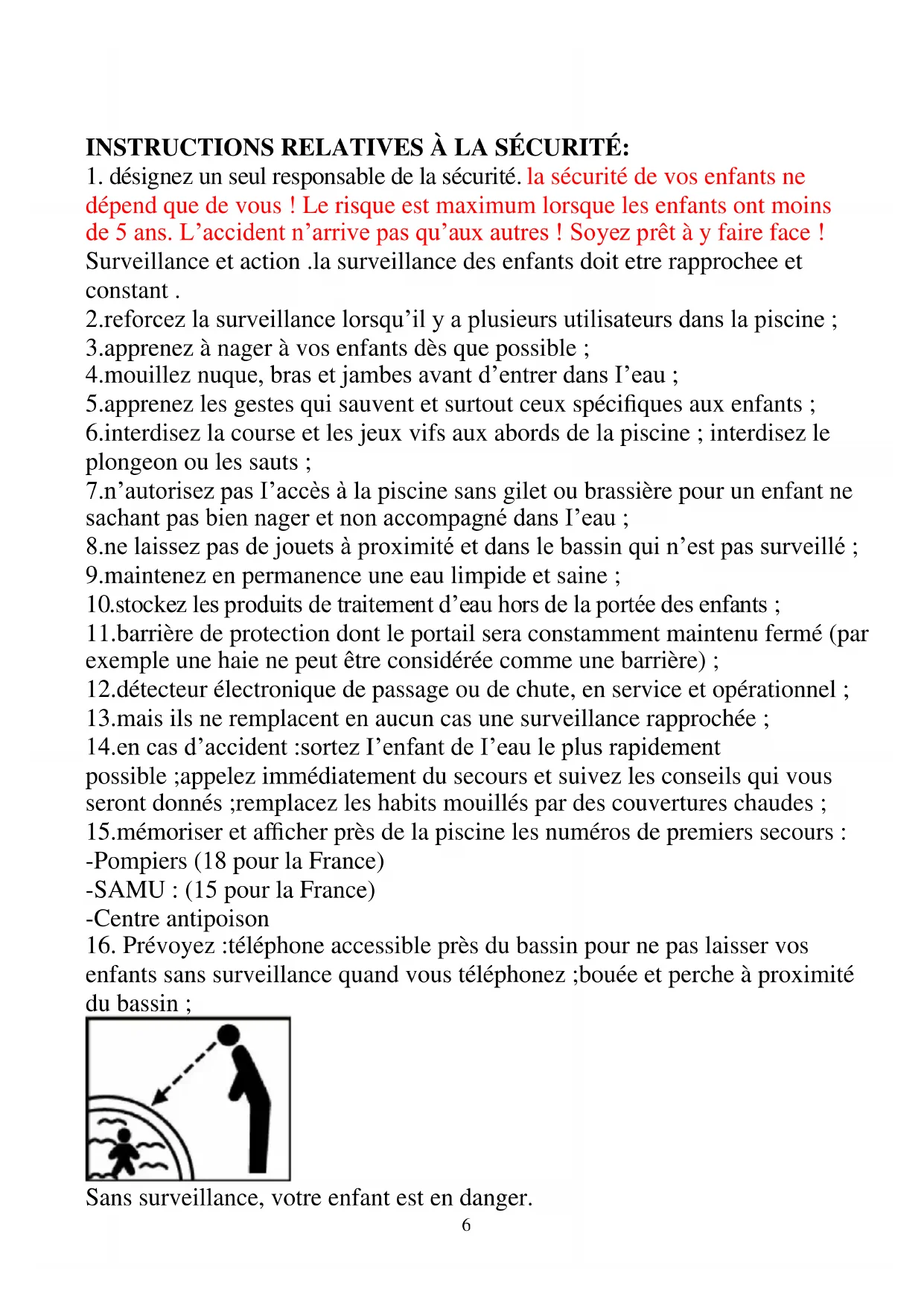 dépend que de vous ! Le risque est maximum lorsque les enfants ont moins de 5 ans. L’accident n’arrive pas qu’aux autres ! Soyez prêt à y faire face ! Surveillance et action .la surveillance des enfants doit etre rapprochee et constant . 2.reforcez la surveillance lorsqu’il y a plusieurs utilisateurs dans la piscine ; 3.apprenez à nager à vos enfants dès que possible ; 4.mouillez nuque, bras et jambes avant d’entrer dans I’eau ; 5.apprenez les gestes qui sauvent et surtout ceux spécifiques aux enfants ; 6.interdisez la course et les jeux vifs aux abords de la piscine ; interdisez le plongeon ou les sauts ; 7.n’autorisez pas I’accès à la piscine sans gilet ou brassière pour un enfant ne sachant pas bien nager et non accompagné dans I’eau ; 8.ne laissez pas de jouets à proximité et dans le bassin qui n’est pas surveillé ; 9.maintenez en permanence une eau limpide et saine ; 10.stockez les produits de traitement d’eau hors de la portée des enfants ; 11.barrière de protection dont le portail sera constamment maintenu fermé (par exemple une haie ne peut être considérée comme une barrière) ; 12.détecteur électronique de passage ou de chute, en service et opérationnel ; 13.mais ils ne remplacent en aucun cas une surveillance rapprochée ; 14.en cas d’accident :sortez I’enfant de I’eau le plus rapidement possible ;appelez immédiatement du secours et suivez les conseils qui vous seront donnés ;remplacez les habits mouillés par des couvertures chaudes ; 15.mémoriser et afficher près de la piscine les numéros de premiers secours : -Pompiers (18 pour la France) -SAMU : (15 pour la France) -Centre antipoison