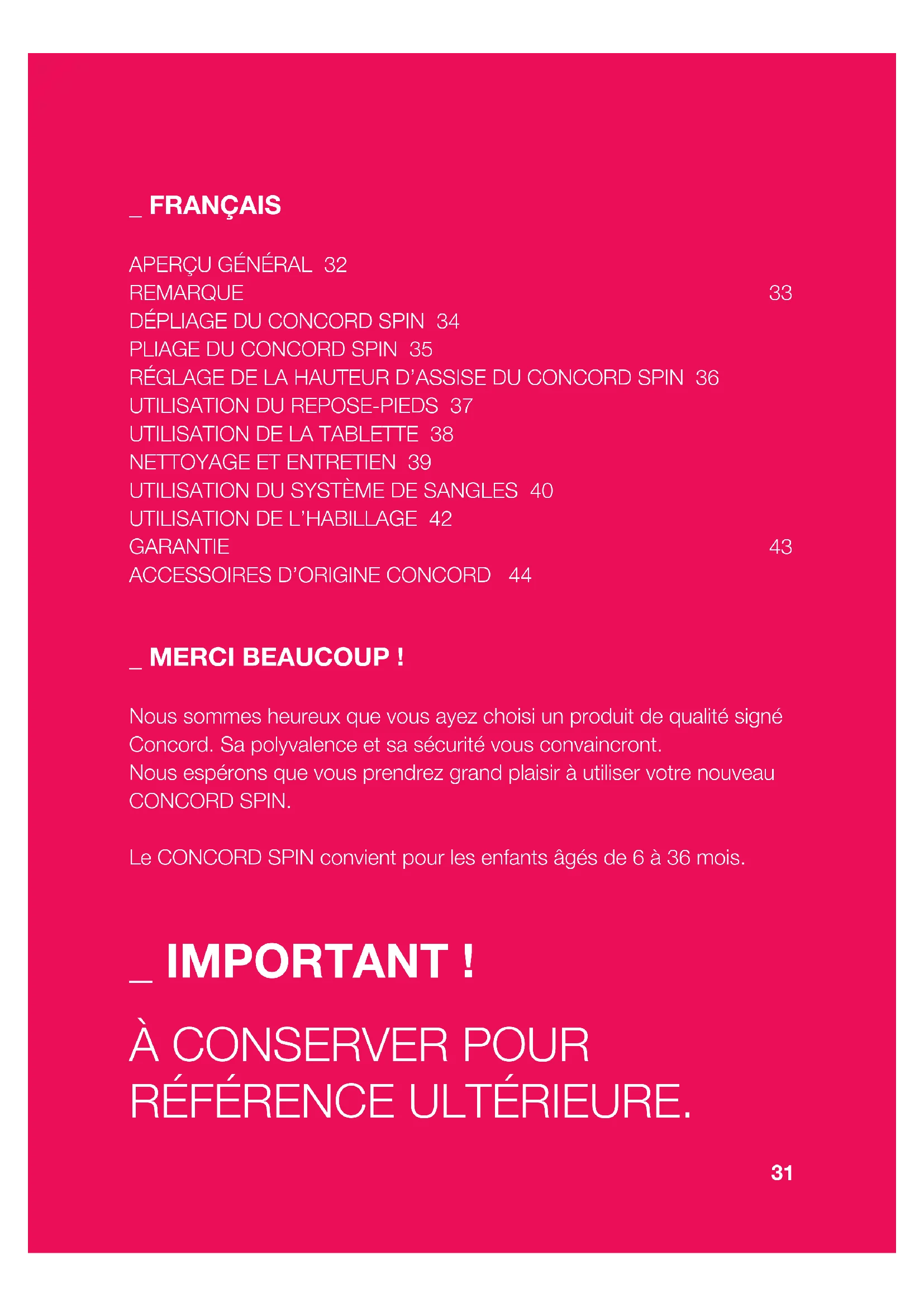 _ MERCI BEAUCOUP ! Nous sommes heureux que vous ayez choisi un produit de qualité signé Concord. Sa polyvalence et sa sécurité vous convaincront. Nous espérons que vous prendrez grand plaisir à utiliser votre nouveau CONCORD SPIN. Le CONCORD SPIN convient pour les enfants âgés de 6 à 36 mois. _ IMPORTANT !32 06 Boutons de blocage
