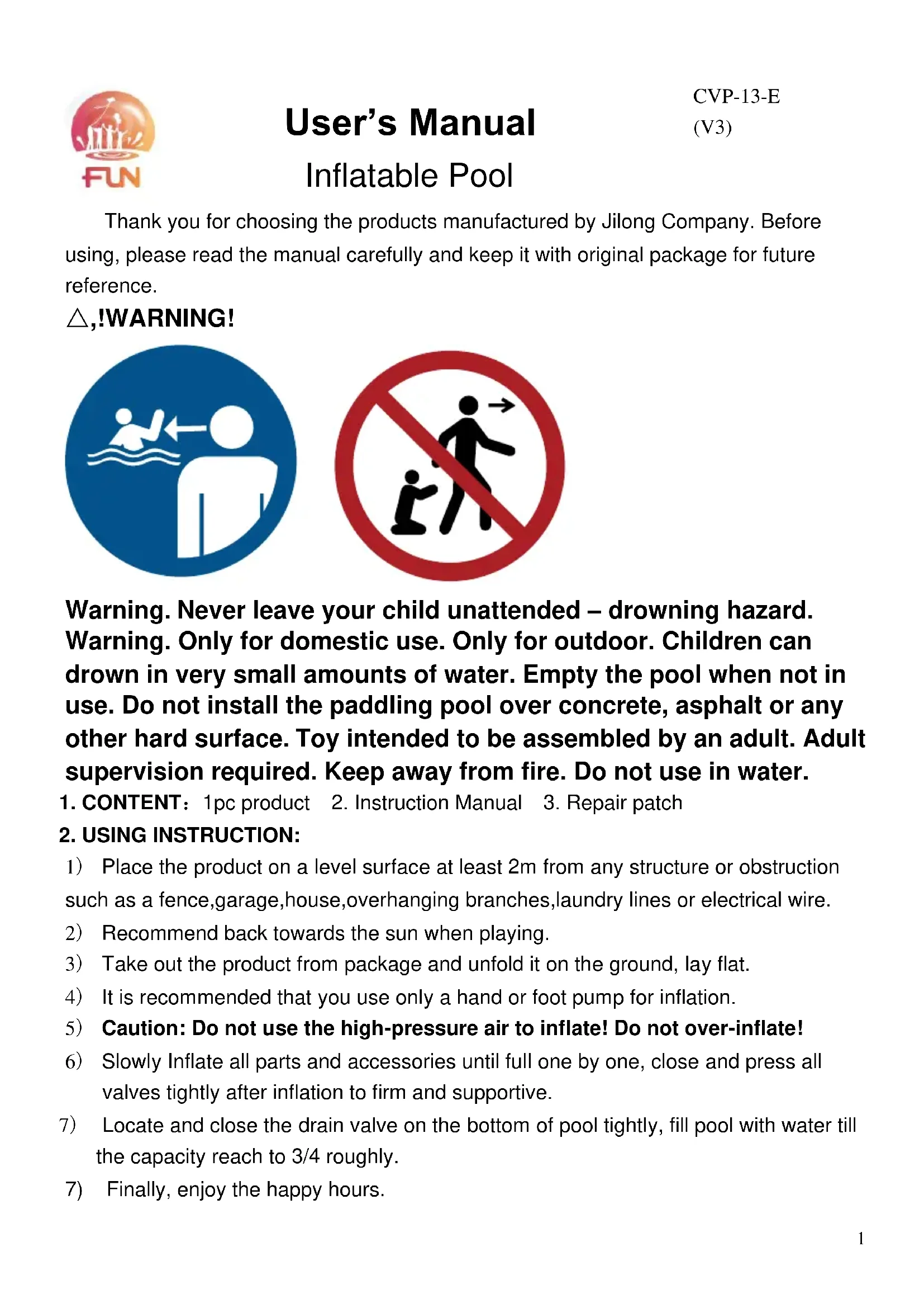 Merci d'avoir choisi parmi les produits fabriqués par Jilong Company. Avant utilisation, veuillez lire le manuel attentivement et le conserver avec l'emballage d'origine pour référence future.