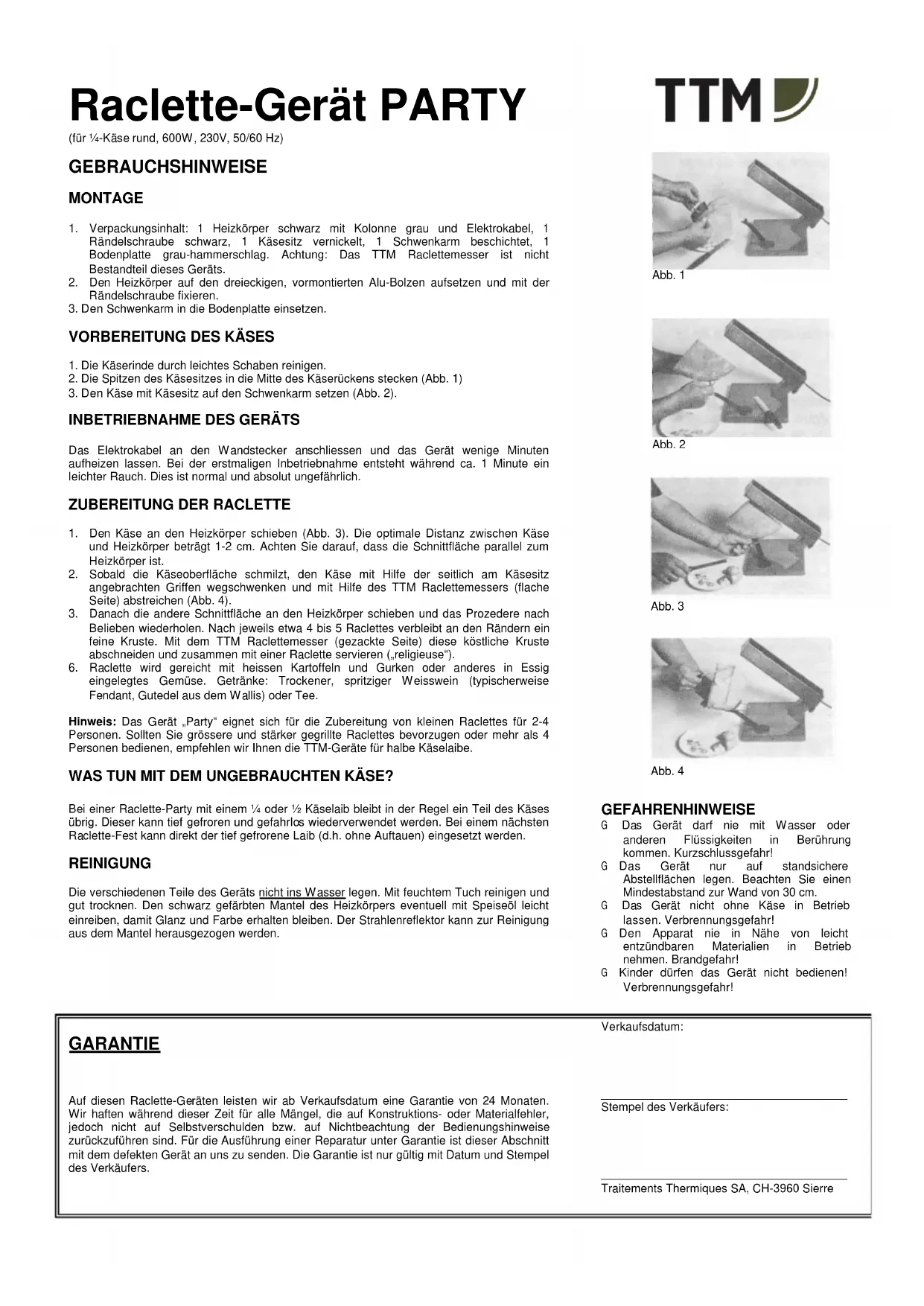 Nous accordons une garantie de 24 mois à partir de la date de vente pour ce four à raclette. Pendant tout la période de garantie, nous répondons de toutes pieces de l'appareil qui pourrait se révérer défectueuses suite à un défaut de fabrication ou de matériel. Toutfootis, nous ne répondons pas des dégats causés par une mauvaise manipulation de l'appareil. Pour toute réparation sous garantie, veuillez nous renvoyer l'appareil'accompagné de ce bulletin. Celui-ci n'est valable que s'il est muni de la date de vente et du timbre du vendeur.