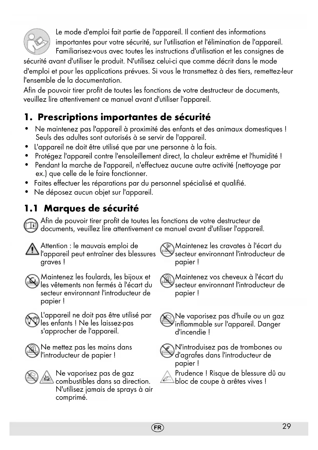 An de pouvoir tirer prot de toutes les fonctions de votre destructeur de documents, veuillez lire attentivement ce manuel avant d'utiliser l'appareil. Attention : le mauvais emploi de l'appareil peut entraîner des blessures graves ! Maintenez les cravates à l'écart du secteur environnant l'introducteur de papier ! Maintenez les foulards, les bijoux et les vêtements non fermés à l'écart du secteur environnant l'introducteur de papier ! Maintenez vos cheveux à l'écart du secteur environnant l'introducteur de papier ! L'appareil ne doit pas être utilisé par les enfants ! Ne les laissez-pas s'approcher de l'appareil. Ne vaporisez pas d'huile ou un gaz inammable sur l'appareil. Danger d'incendie ! Ne mettez pas les mains dans l'introducteur de papier ! N'introduisez pas de trombones ou d'agrafes dans l'introducteur de papier ! Ne vaporisez pas de gaz combustibles dans sa direction. N'utilisez jamais de sprays à air comprimé. Prudence ! Risque de blessure dû au bloc de coupe à arêtes vives !30