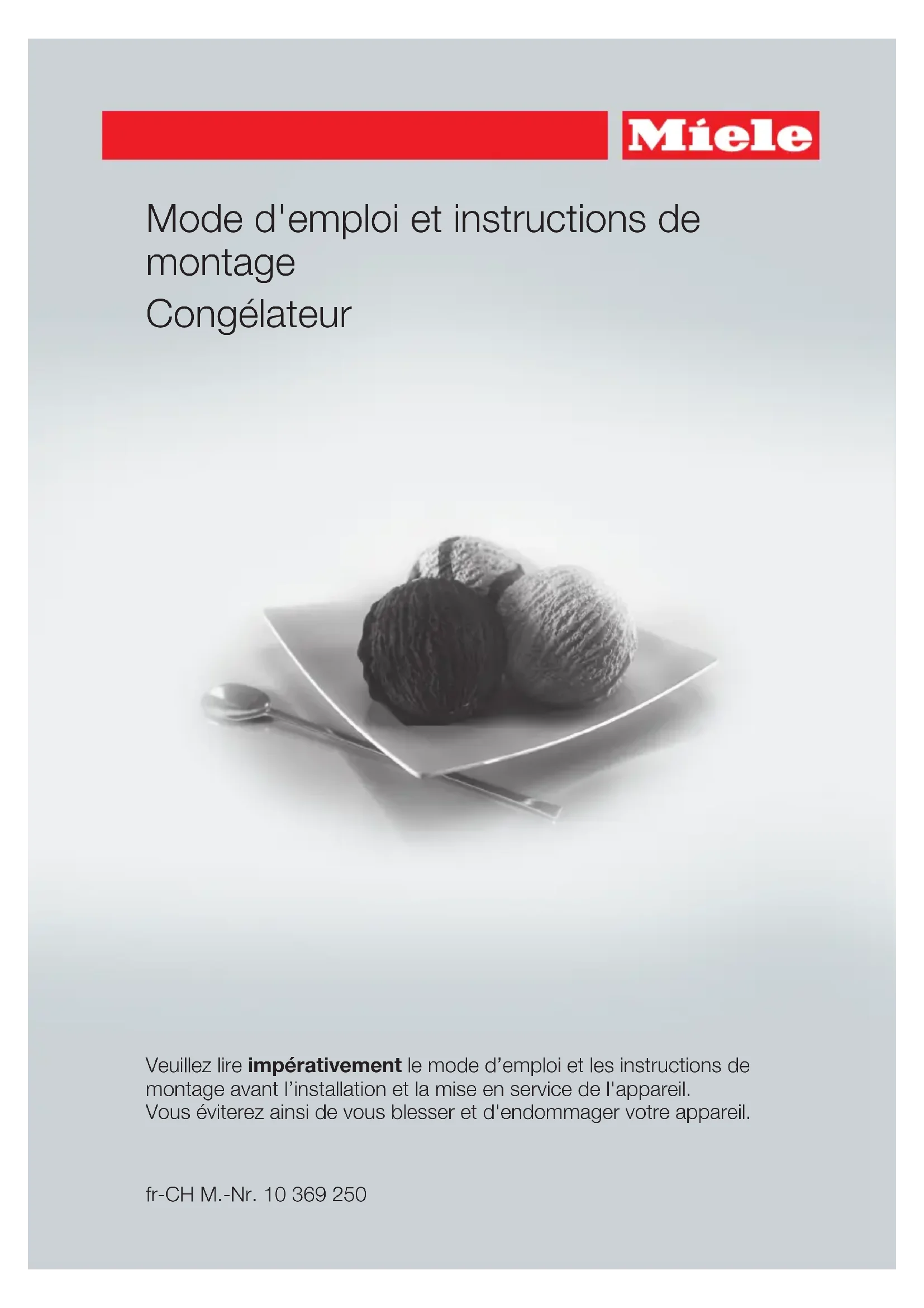 Mode d'emploi et instructions de montage Congélateur Veuillez lire impérativement le mode d’emploi et les instructions de montage avant l’installation et la mise en service de l'appareil. Vous éviterez ainsi de vous blesser et d'endommager votre appareil. fr-CH M.-Nr. 10 369 250Table des matières