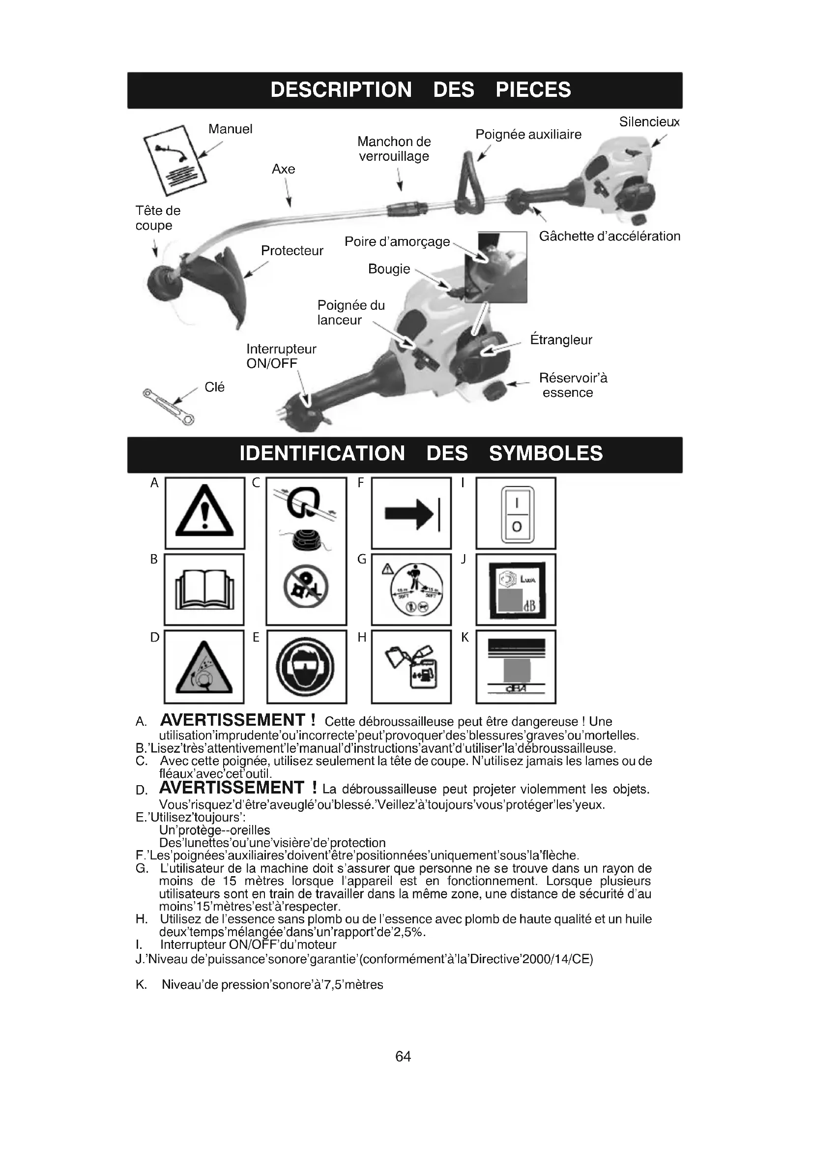 A. AVERTISSEMENT ! Cette débroussailleuse peut être dangereuse ! Une utilisation imprudente ou incorrecte peut provoquer des blessures graves ou mortelles. B. Lisez très attentivement le manual d instructions avant d utiliser la débroussailleuse. C. Avec cette poignée, utilisez seulement la tête de coupe. N utilisez jamais les lames ou de fléaux avec cet outil.