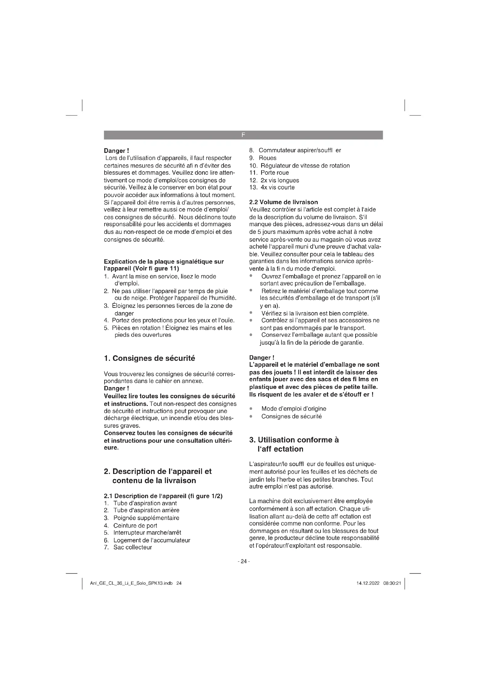 l‘aff ectation L‘aspirateur/le souffl eur de feuilles est unique- ment autorisé pour les feuilles et les déchets de jardin tels l‘herbe et les petites branches. Tout autre emploi n‘est pas autorisé. La machine doit exclusivement être employée conformément à son aff ectation. Chaque uti- lisation allant au-delà de cette aff ectation est considérée comme non conforme. Pour les dommages en résultant ou les blessures de tout genre, le producteur décline toute responsabilité et l’opérateur/l’exploitant est responsable. Anl_GE_CL_36_Li_E_Solo_SPK13.indb 24Anl_GE_CL_36_Li_E_Solo_SPK13.indb 24 14.12.2022 08:30:2114.12.2022 08:30:21F