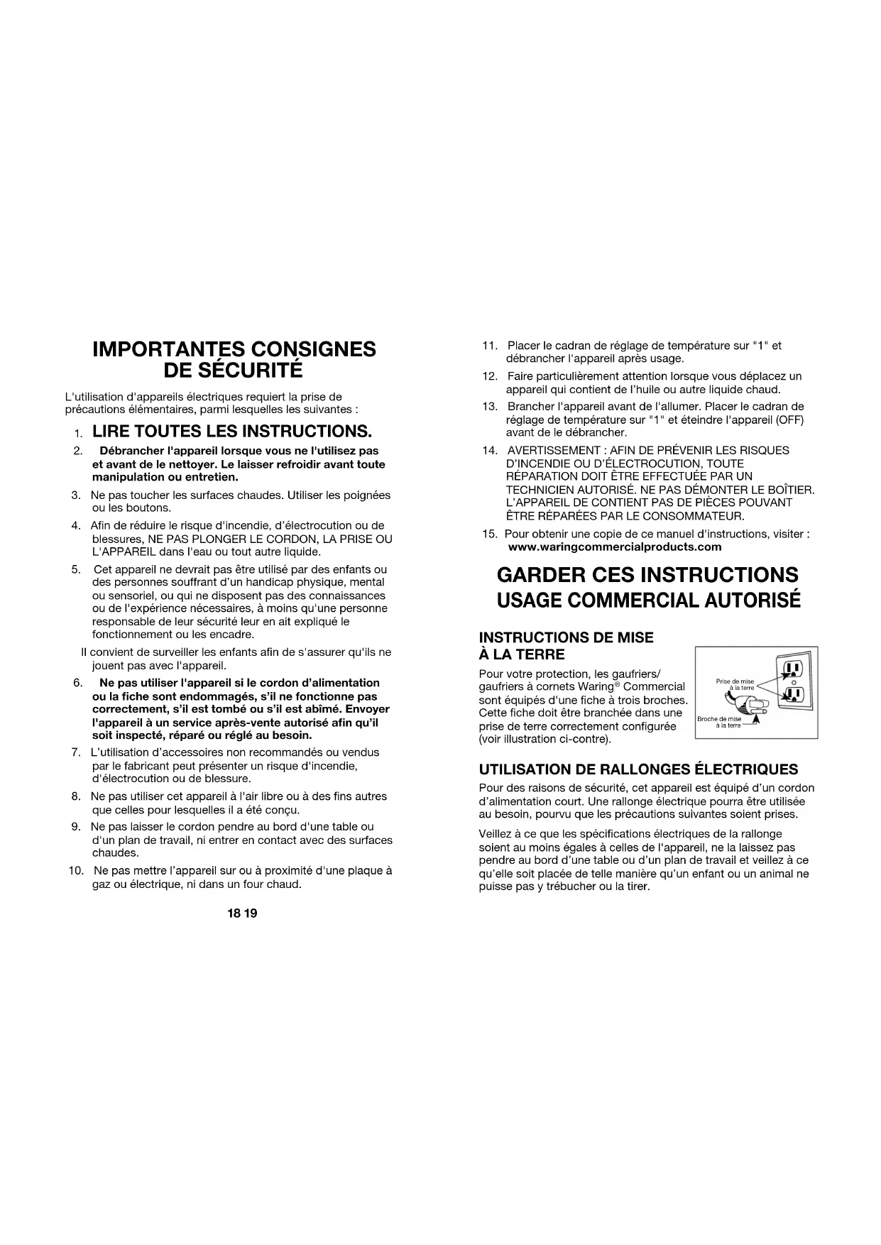 Pour toute protection, les gaufriers/gaufriers à cornets Waring® Commercial sont équipés d'une fiche à trois broches. Cette fiche doit être branchée dans une prise de terre correctement configurée (voir illustration ci-contre).