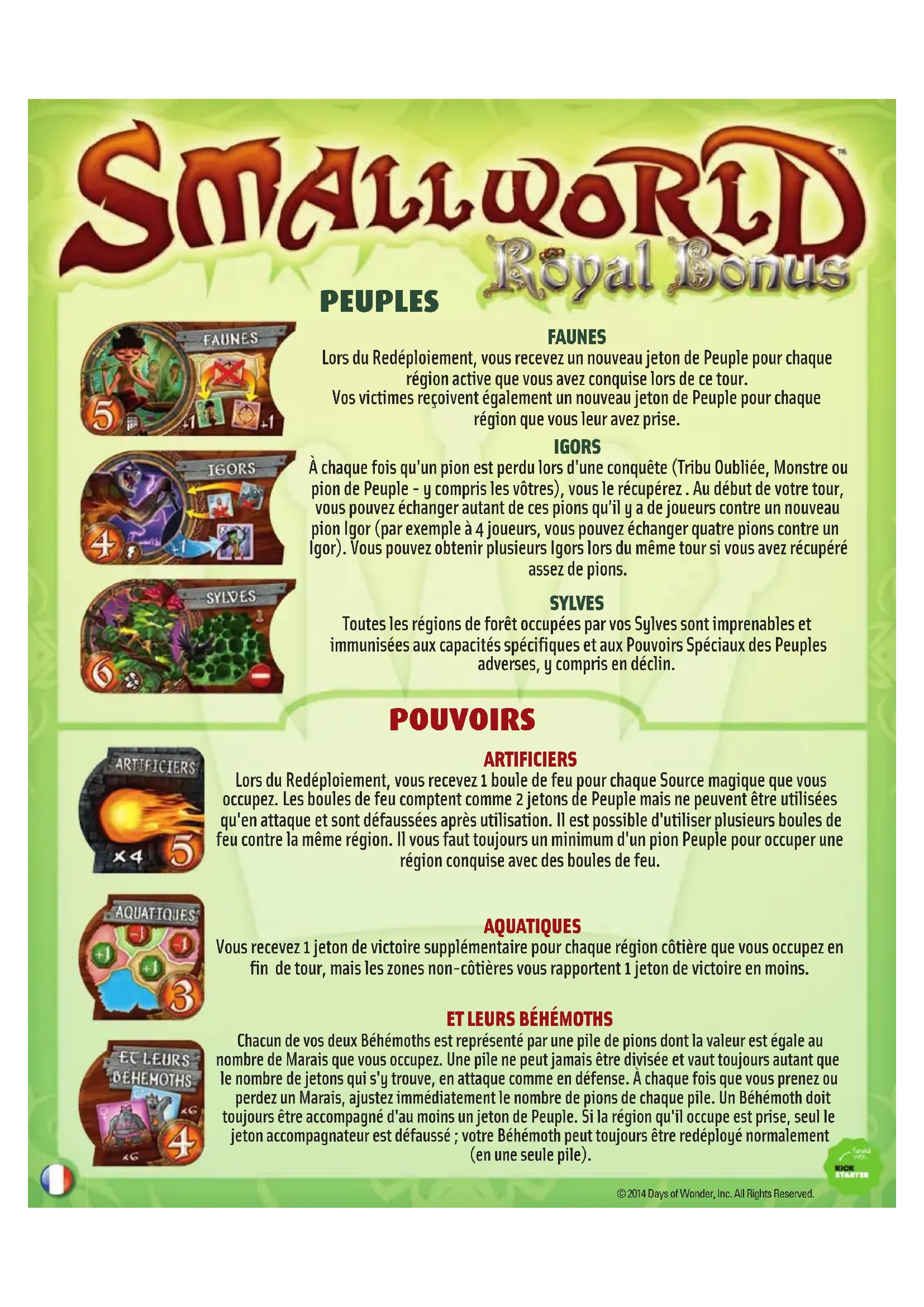 Chacun de vos deux Béhémoths est représenté par une pile de pions dont la valeur est égale au nombre de Marais que vous occupez. Une pile ne peut jamais être divisée et vaut toujours autant que le nombre de jetons qui s'y trouve, en attaque comme en défense. À chaque fois que vous prenez ou perdez un Marais, ajustez immédiatement le nombre de pions de chaque pile. Un Béhémoth doit toujours être accompagné d'au moins un jeton de Peuple. Si la région qu'il occupe est prise, seul le jeton accompagnateur est défaussé ; votre Béhémoth peut toujours être redéployé normalement (en une seule pile). © 2014 Days of Wonder, Inc. All Rights Reserved. POUVOIRS KS Royal Bonus helper DEF V2_Mise en page 1 25/08/14 11:10 Page3