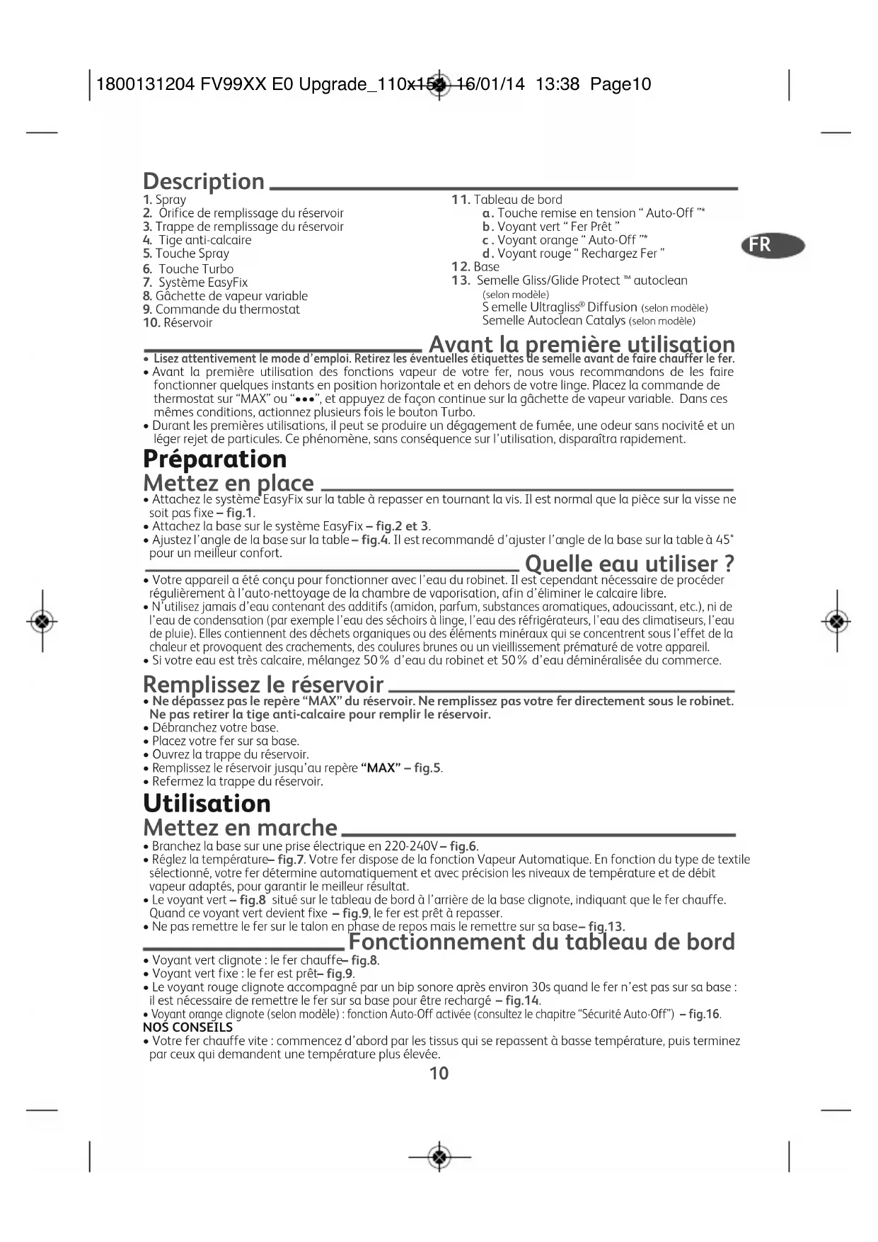- Votre fer chauffe vite : commencez d’abord par les tissus qui se repassent à basse température, puis terminez par ceux qui demandent une température plus élevée. 1800131204FV99XXE0Upgrade_110x15416/01/1413:38Page10• Si vous baissez le thermostat, remettez le fer sur sa base et attendez (environ 10 minutes) que le fer refroidisse afin de ne pas bruler votre tissu.