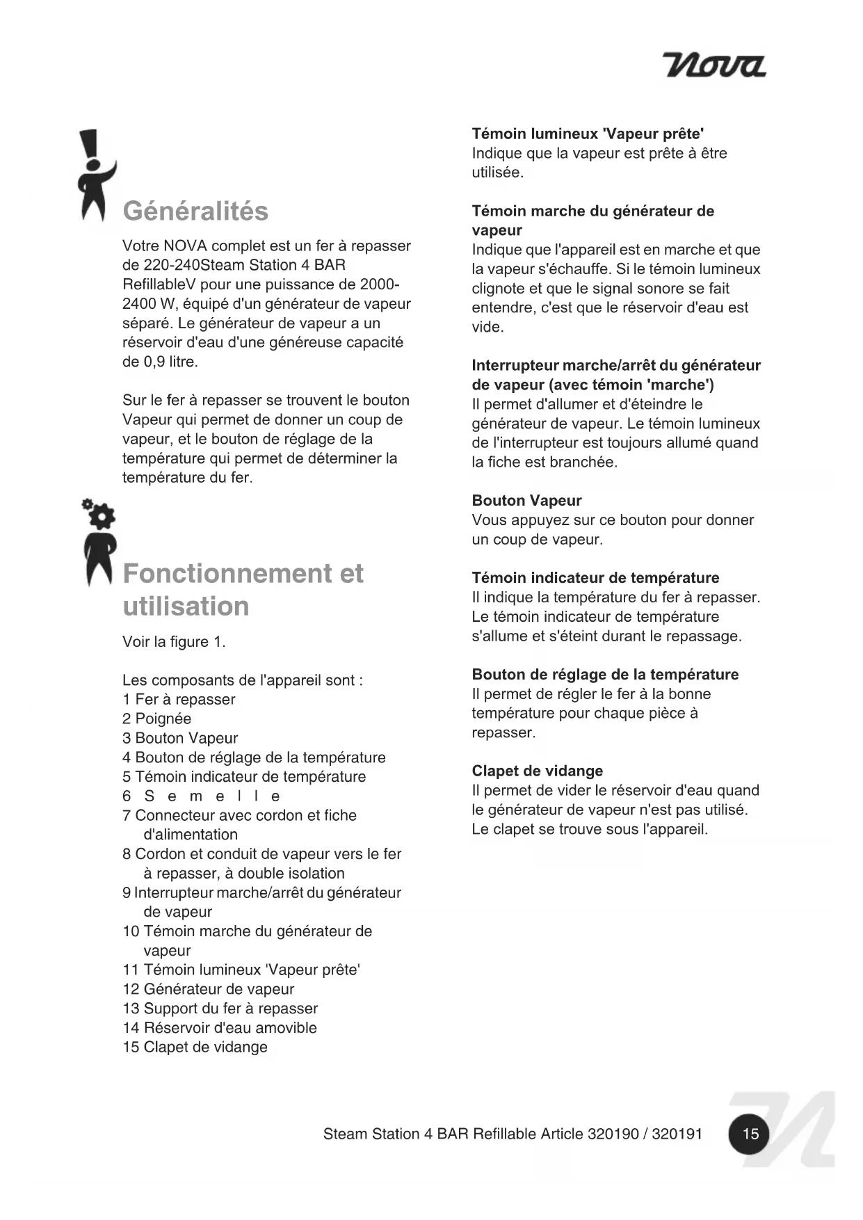 - 2002/96/EC15 Steam Station 4 BAR Refillable Article 320190 / 320191 Généralités Votre NOVA complet est un fer à repasser de 220-240Steam Station 4 BAR RefillableV pour une puissance de 2000- 2400 W, équipé d'un générateur de vapeur séparé. Le générateur de vapeur a un réservoir d'eau d'une généreuse capacité de 0,9 litre. Sur le fer à repasser se trouvent le bouton Vapeur qui permet de donner un coup de vapeur, et le bouton de réglage de la température qui permet de déterminer la température du fer. Fonctionnement et utilisation Voir la figure 1. Les composants de l'appareil sont : 1 Fer à repasser 2 Poignée 3 Bouton Vapeur 4 Bouton de réglage de la température 5 Témoin indicateur de température 6Semelle 7 Connecteur avec cordon et fiche d'alimentation 8 Cordon et conduit de vapeur vers le fer à repasser, à double isolation 9 Interrupteur marche/arrêt du générateur de vapeur 10 Témoin marche du générateur de vapeur 11 Témoin lumineux 'Vapeur prête' 12 Générateur de vapeur 13 Support du fer à repasser 14 Réservoir d'eau amovible 15 Clapet de vidange Témoin lumineux 'Vapeur prête' Indique que la vapeur est prête à être utilisée. Témoin marche du générateur de vapeur Indique que l'appareil est en marche et que la vapeur s'échauffe. Si le témoin lumineux clignote et que le signal sonore se fait entendre, c'est que le réservoir d'eau est vide. Interrupteur marche/arrêt du générateur de vapeur (avec témoin 'marche') Il permet d'allumer et d'éteindre le générateur de vapeur. Le témoin lumineux de l'interrupteur est toujours allumé quand la fiche est branchée. Bouton Vapeur Vous appuyez sur ce bouton pour donner un coup de vapeur. Témoin indicateur de température Il indique la température du fer à repasser. Le témoin indicateur de température s'allume et s'éteint durant le repassage. Bouton de réglage de la température Il permet de régler le fer à la bonne température pour chaque pièce à repasser. Clapet de vidange Il permet de vider le réservoir d'eau quand le générateur de vapeur n'est pas utilisé. Le clapet se trouve sous l'appareil.16 Steam Station 4 BAR Refillable Article 320190 / 320191 Avant la première utilisation