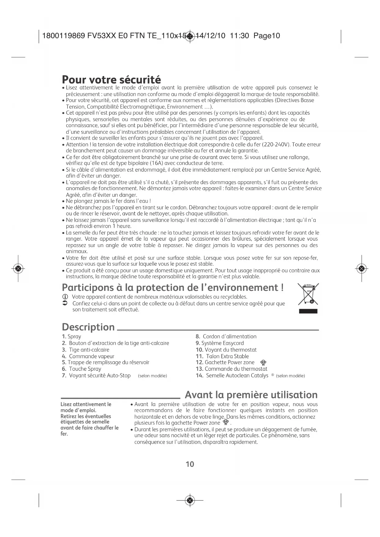- Durant les premières utilisations, il peut se produire un dégagement de fumée, une odeur sans nocivité et un léger rejet de particules. Ce phénomène, sans conséquence sur l’utilisation, disparaîtra rapidement. Lisez attentivement le mode d’emploi. Retirez les éventuelles étiquettes de semelle avant de faire chauffer le fer. 1800119869 FV53XX E0 FTN TE_110x154 14/12/10 11:30 Page10EN