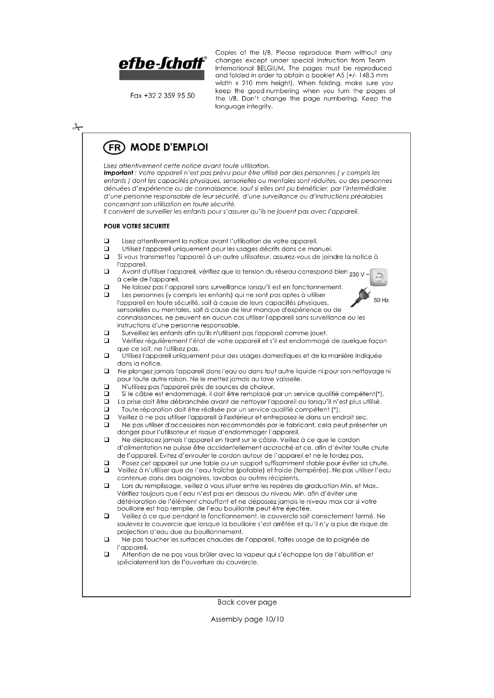 Fax +32 2 359 95 50 Veuillez laisser refroidir votre appareil avant tout nouveau remplissage ou avant nettoyage. Si votre bouilloire comporte un socle séparé, celle-ci doit être utilisée uniquement avec le socle qui lui est associé.