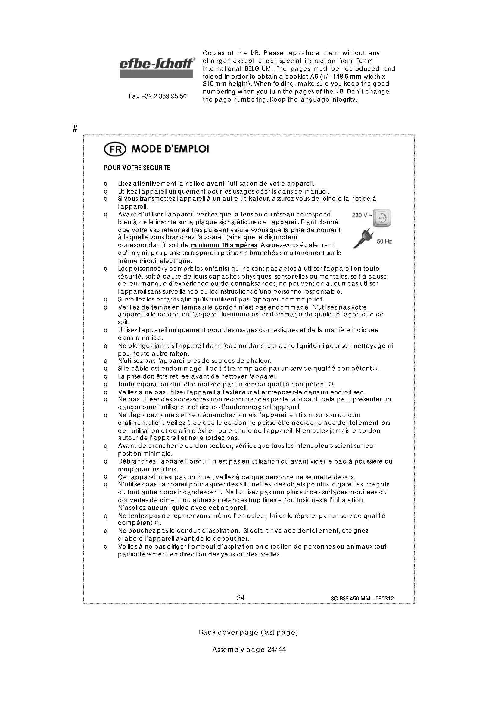 Back cover page (last page) Assembly page 26/44 Fax +32 2 359 95 50 UTILISATION DES ACCESSOIRES ET DES BOUTONS DE REGLAGE Suceur combiné – bouton de réglage abaissé vers l'avant. Dans cette position le suceur combiné convient pour les tapis et le tapis plein. Suceur combiné – bouton de réglage abaissé vers l'arrière. Dans cette position le suceur combiné convient pour les sols durs. Les poils de la brosse sont sortis. Le suceur plat est situé dans le logement des accessoires (à l'arrière de l'appareil, à gauche du cordon d'alimentation) et sert à nettoyer entre les éléments des radiateurs, à nettoyer les coins, les tiroirs etc. Le suceur plat avec la petite brosse sert à nettoyer les meubles rembourrés, les sièges de la voiture, les matelas et par exemple les claviers d'ordinateur.# Copies of the I/B. Please reproduce them without any changes except under special instruction from Team International BELGIUM. The pages must be reproduced and folded in order to obtain a booklet A5 (+/- 148.5 mm width x 210 mm height). When folding, make sure you keep the good numbering when you turn the pages of the I/B. Don’t change the page numbering. Keep the language integrity.