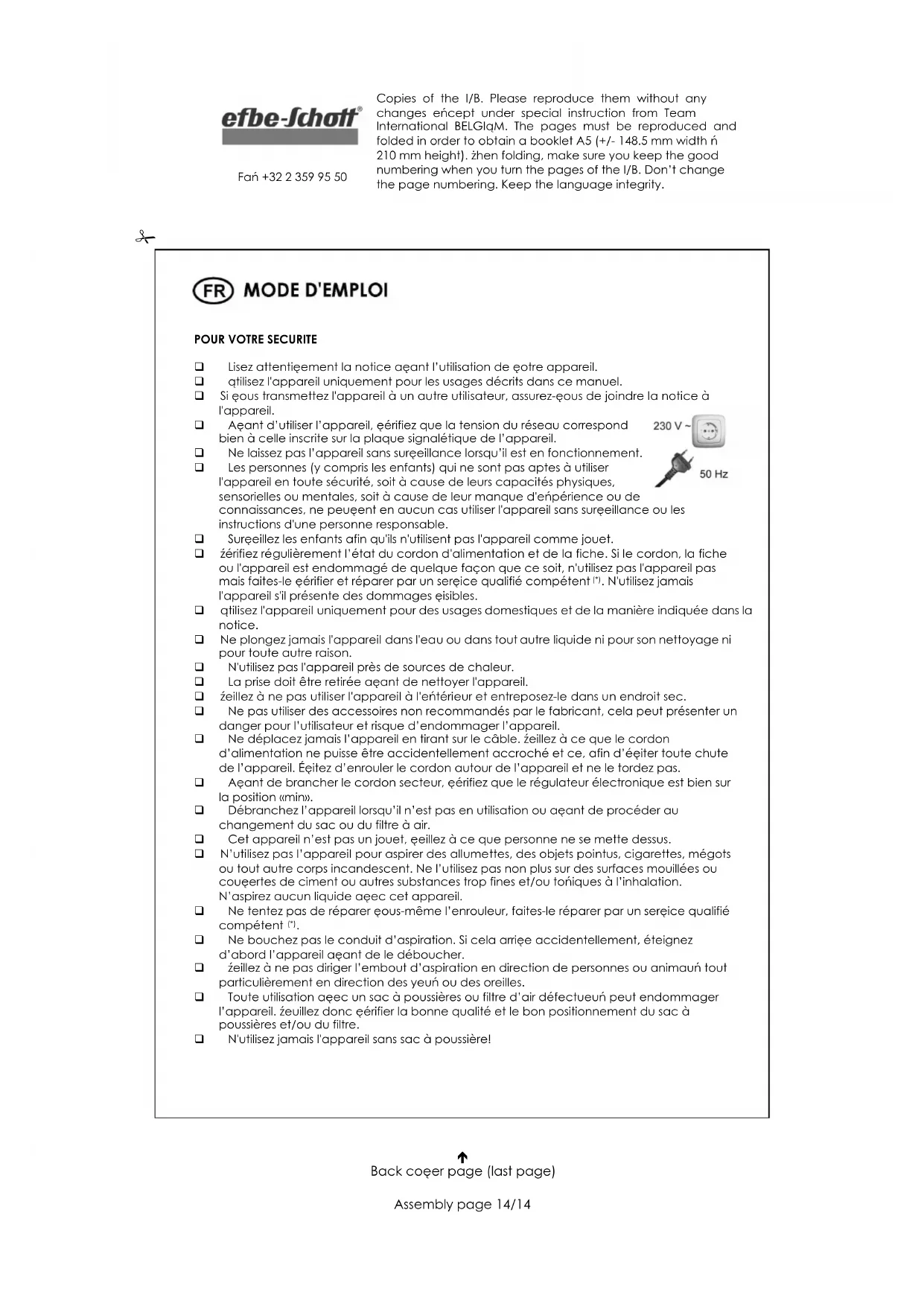 Fax +32 2 359 95 50 Si votre appareil n’aspire plus correctement ou que le témoin rouge s’allume, veuillez procéder au changement du sac afin de ne pas provoquer une surchauffe de l’appareil.