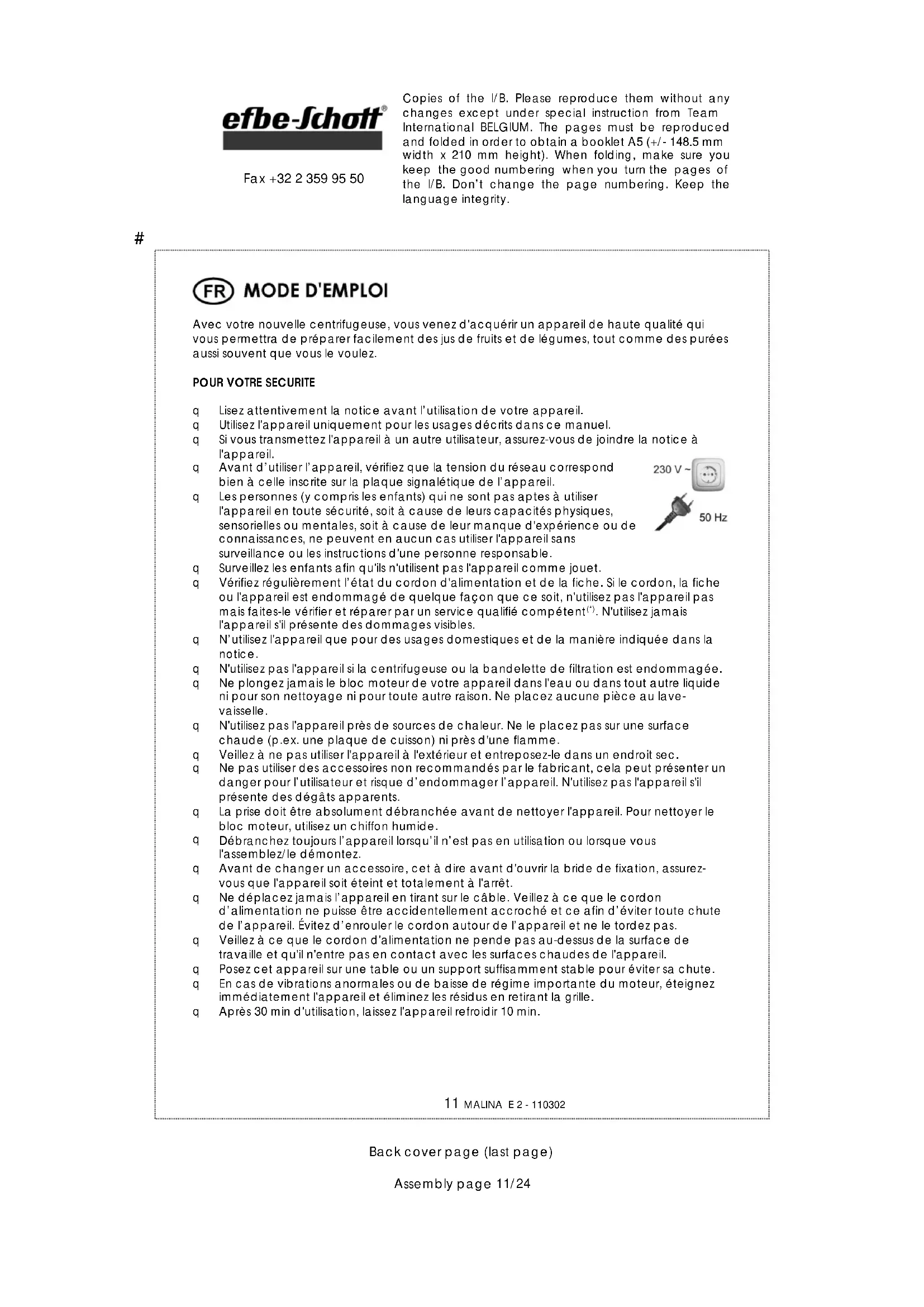 Back cover page (last page) Assembly page 11/24 Fax +32 2 359 95 50 Avec votre nouvelle centrifugeuse, vous venez d'acquérir un appareil de haute qualité qui vous permettra de préparer facilement des jus de fruits et de légumes, tout comme des purées aussi souvent que vous le voulez.