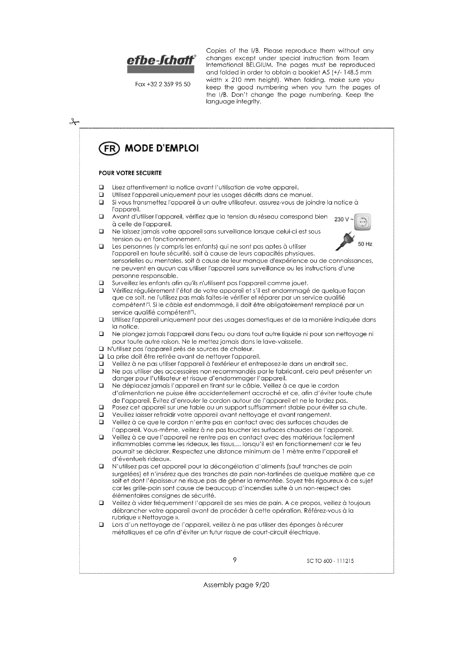 Utilisez l'appareil uniquement pour des usages domestiques et de la manière indiquée dans la notice. Ne plongez jamais l'appareil dans l'eau ou dans tout autre liquide ni pour son nettoyage ni pour toute autre raison. Ne le mettez jamais dans le lave-vaisselle. N'utilisez pas l'appareil près de sources de chaleur. La prise doit être retirée avant de nettoyer l'appareil. Veillez à ne pas utiliser l'appareil à l'extérieur et entreposez-le dans un endroit sec. Ne pas utiliser des accessoires non recommandés par le fabricant, cela peut présenter un danger pour l’utilisateur et risque d’endommager l’appareil. Ne déplacez jamais l’appareil en tirant sur le câble. Veillez à ce que le cordon d’alimentation ne puisse être accidentellement accroché et ce, afin d’éviter toute chute de l’appareil. Évitez d’enrouler le cordon autour de l’appareil et ne le tordez pas. Posez cet appareil sur une table ou un support suffisamment stable pour éviter sa chute. Veuillez laisser refroidir votre appareil avant nettoyage et avant rangement. Veillez à ce que le cordon n’entre pas en contact avec des surfaces chaudes de l’appareil. Vous-même, veillez à ne pas toucher les surfaces chaudes de l’appareil. Veillez à ce que l’appareil ne rentre pas en contact avec des matériaux facilement inflammables comme les rideaux, les tissus,... lorsqu’il est en fonctionnement car le feu pourrait se déclarer. Respectez une distance minimum de 1 mètre entre l’appareil et d’éventuels rideaux. N’utilisez pas cet appareil pour la décongélation d’aliments (sauf tranches de pain surgelées) et n’insérez que des tranches de pain non-tartinées de quelque matière que ce soit et dont l’épaisseur ne risque pas de gêner la remontée. Soyez très rigoureux à ce sujet car les grille-pain sont cause de beaucoup d’incendies suite à un non-respect des élémentaires consignes de sécurité. Veillez à vider fréquemment l’appareil de ses mies de pain. A ce propos, veillez à toujours débrancher votre appareil avant de procéder à cette opération. Référez-vous à la rubrique « Nettoyage ». Lors d’un nettoyage de l’appareil, veillez à ne pas utiliser des éponges à récurer métalliques et ce afin d’éviter un futur risque de court-circuit électrique.