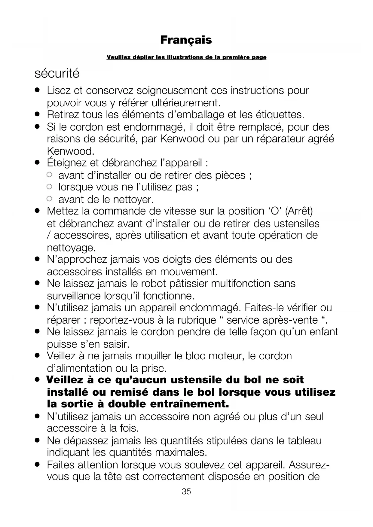 N’employez l’appareil qu’à des fins domestiques. Kenwood décline toute responsabilité dans les cas où l’appareil est utilisé incorrectement ou que les présentes instructions ne sont pas respectées.